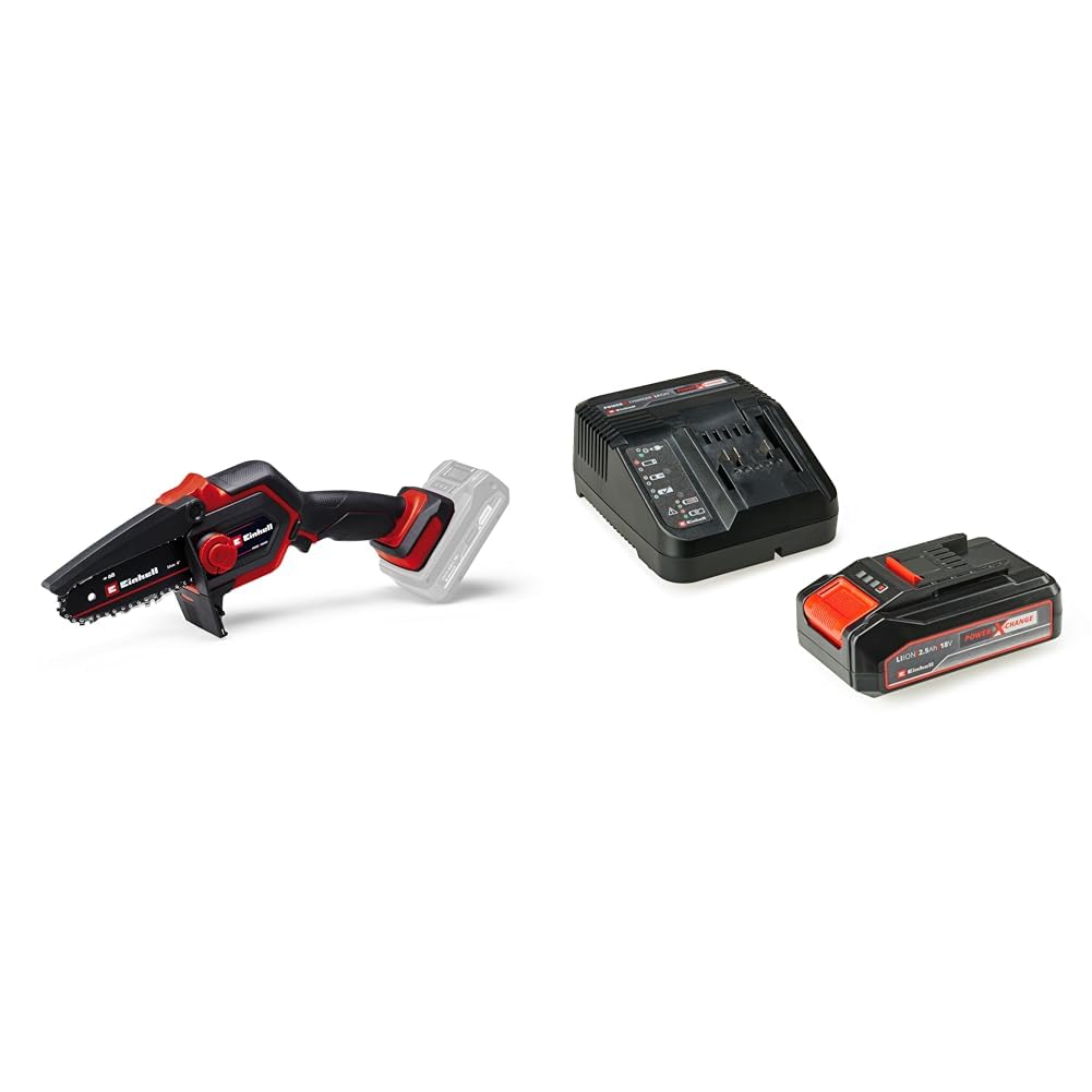 Une protection de guide permet un rangement sécurisé. Faisant partie de la famille Einhell Power X-Change, elle est compatible avec toutes les batteries et chargeurs de cette série. Avec une longueur de guide de 19,2 cm et une longueur de coupe de 15 cm, cette tronçonneuse compacte et légère est parfaite pour une utilisation flexible dans le jardin. Ces accessoires sont disponibles séparément. Sécurité – Pour une utilisation sûre, l’élagueuse est équipée d’un protège-main, d’un capot de chaîne rabattable et d’une surface d’appui permettant une manipulation des deux mains. Mini Tronconneuse A Batterie Einhell Professional Elagueuse Sans Fil FORTEXXA 18/20 TH Solo - Power X- Change (18V, Moteur Sans Charbon, Régime Max 3 800 Tr/min Max) Livré Sans Batterie Ni Chargeur Capot Chaîne Pliable Sécurité La livraison s’effectue sans batterie ni chargeur, disponibles séparément en kit de démarrage. Accessoires – L’élagueuse est vendue avec une protection du guide-chaîne pour un rangement sûr et avec un entonnoir pour rajouter de l’huile proprement pour la lubrification automatique de la chaîne. Elle est fournie avec un guide et une chaîne de haute qualité, garantissant des coupes précises et des résultats optimaux. La chaîne peut aussi être retendue sans outil en actionnant une molette de réglage située sur le carter. GP-PS 18/20 Li BL-Solo | Akku-Astkettensäge La tronçonneuse sur batterie Einhell Professional GP-PS 18/20 Li BL-Solo est un outil polyvalent et maniable, idéal pour les coupes de retour et de forme sur arbres et arbustes, le broyage des déchets verts ainsi que la coupe de petits bois de section. Les opérations d’entretien, telles que le remplacement du guide et de la chaîne ou le réglage de la tension de la chaîne, sont particulièrement simples grâce à une commande sans outil via un bouton rotatif. Power X-Change – L’élagueuse sans fil GP-PS 18/20 Li BL-Solo Professional Einhell fait partie de la gamme Power X-Change, dans laquelle les batteries et les appareils peuvent être combinés. Le moteur efficace réduit les vibrations et permet une vitesse de chaîne allant jusqu’à 8 m/s. Polyvalente, compacte et ultra maniable, la tronçonneuse sur batterie GP-PS 18/20 Li BL-Solo est l’outil idéal pour les coupes de précision sur arbustes, petits arbres ou déchets verts. Elle fait partie de la gamme Power X-Change et est compatible avec toutes les batteries et chargeurs de la série Einhell Akku-Atkettenäge GE-P 18/15 Li BL-olo Power X-Change im Un entonnoir de remplissage est inclus pour un ravitaillement propre de la lubrification automatique de la chaîne.