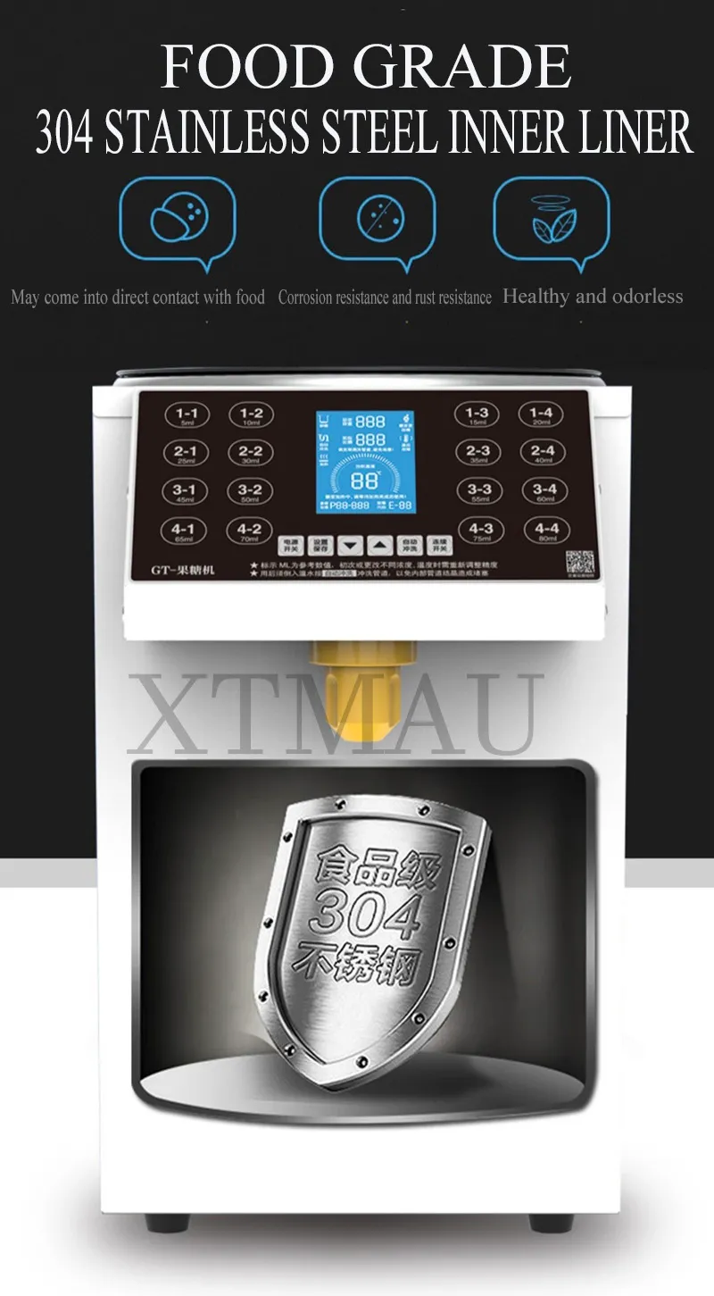 Distributeur Sirop 450W 220V Machine Automatique Pour Thé Au Lait, Poudre De Matcha, Café, Machine Quantitative, Doseur De Fructose, Distributeur De Poudre De Sucre Machine Quantitative 450W Paillasson antidérapant : stable et durable. Multifonction : en plus de la distribution quantitative de fructose, il dispose également de fonctions de chauffage et de maintien au chaud qui peuvent empêcher la cristallisation du sirop, vous permettant de profiter du fructose chaud même en hiver froid Distributeur de sucre pour thé à bulles 7.5L Machine quantitative de fructose Machine à fructose entièrement automatique à 16 grilles Distributeur de sirop Poids de l'emballage : 7 kg. Capteur : empêche la machine d'être endommagée en raison d'une faible teneur en fructose. Distributeur de sirop machine de magasin de thé au lait machine à fructose élect Fût en acier inoxydable : résistant à la corrosion, facile à nettoyer, propre et durable. Description: Cette machine de dosage intelligente de fructose peut afficher différentes boissons et configurations de fructose. Spécifications: Couleur : noir. Matériau : acier inoxydable., Capacité : 7,5 l., Puissance : 450 W. Modèle : BC-16A Tension : 220 V/50 Hz. Nous vous répondrons le plus rapidement possible et résoudrons le problème pour vous. Service après-vente : Nous nous engageons à fournir des produits et des services de qualité supérieure. À l'intérieur se trouve un capteur qui empêche la machine d'être endommagée en raison d'une faible teneur en fructose.