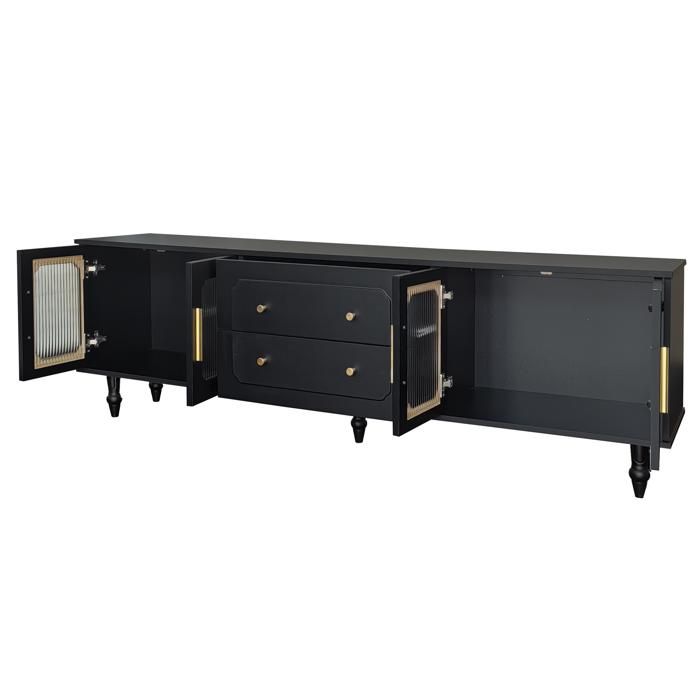 Meuble Tv 175x38x55.5cm, Style Rétro, Avec 2 Portes En Rotin Et 2 Tiroirs, Pieds En Bois Métal