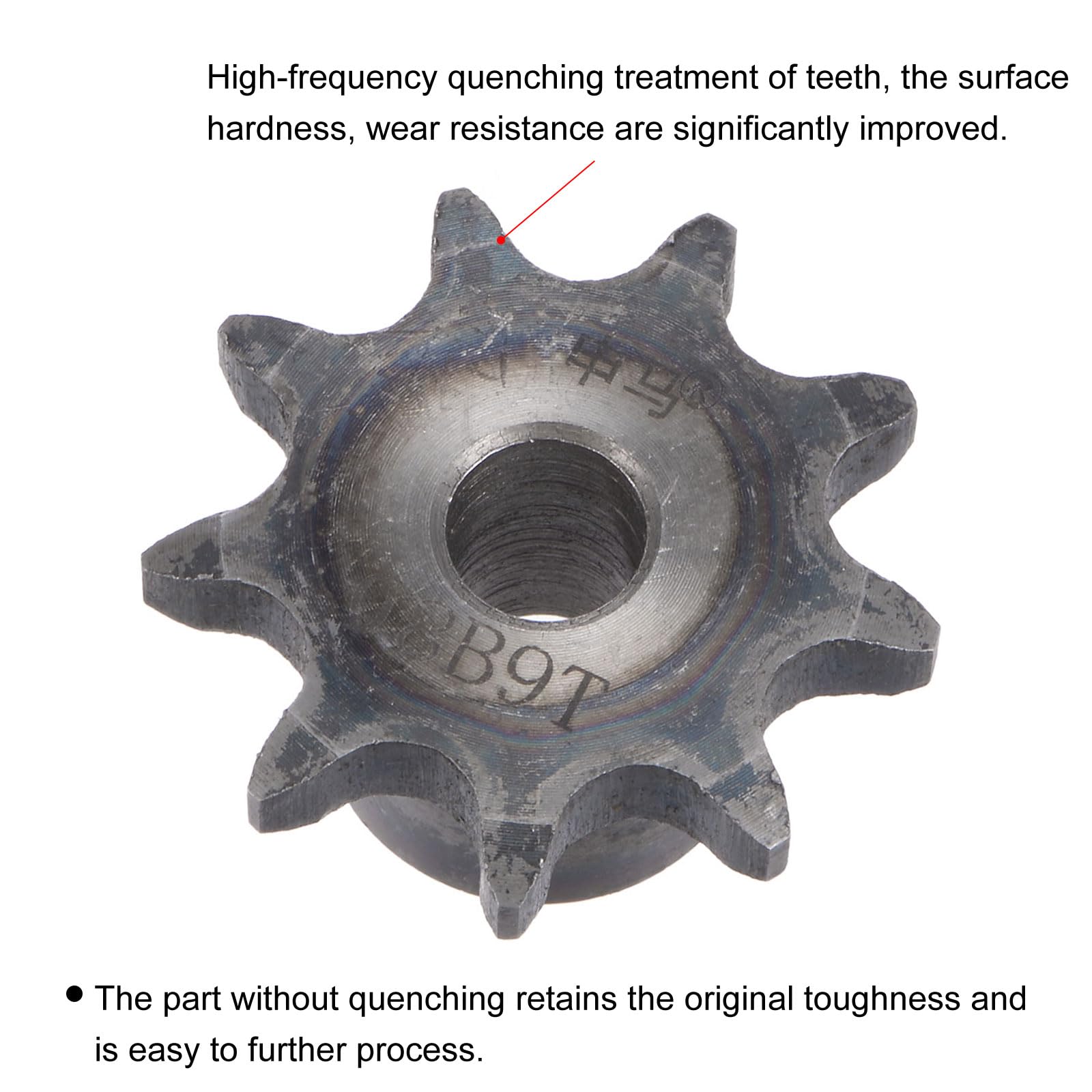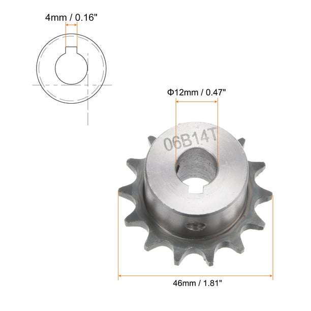 Pignon SOURCING MAP 2 Kits ISO/DIN 06B-1 Type B 20mm Alésage Pignon Pas 1/2 Alésage 10mm Uxcell Pignon à 20 Dents De Type B, Chaîne #25, Siple Brin, Pas De 6 Pignon 9 Dents Type B Pas 1/2 Largement utilisé dans la fraiseuse, la perceuse ou d'autres occasions de transmission de machines. Contenu de l'emballage : 1 pignon de chaîne Chaque pignon de chaîne à rouleaux est livré avec des dents solides qui peuvent s'accrocher à la chaîne. Ce pignon de 9 dents en acier carbone A3 est parfait pour tes projets mécaniques. Pas 3/8" (8mm d'alésage), il est traité thermiquement pour résister à l'usure Il est suggéré que les pignons de chaîne aient au moins trois dents en maille avec la chaîne. Spécifications: Matériau: Acier au carbone A3 Dureté: 58-60HRC Nombre de dents: 14 Diamètre externe: 61mm / 2.4-pouce Largeur de la bosse: 17mm / .67-pouce... Il peut être transformé en différentes tailles de diamètre intérieur selon les conditions d'utilisation. Les pignons de chaîne sont normalement montés dans une position fixe sur un arbre fixe.