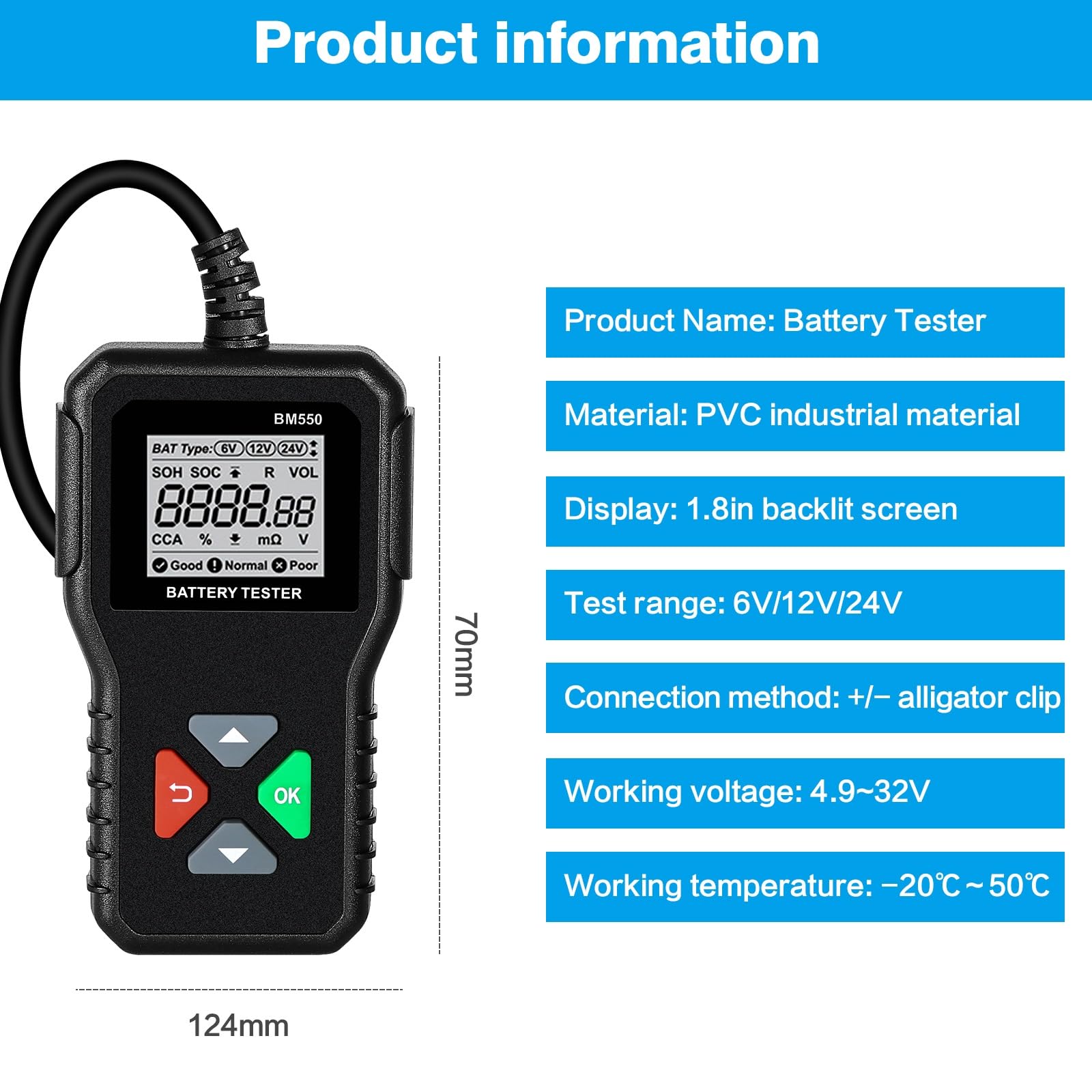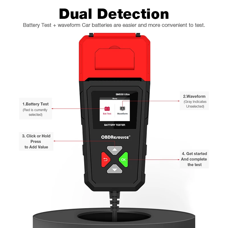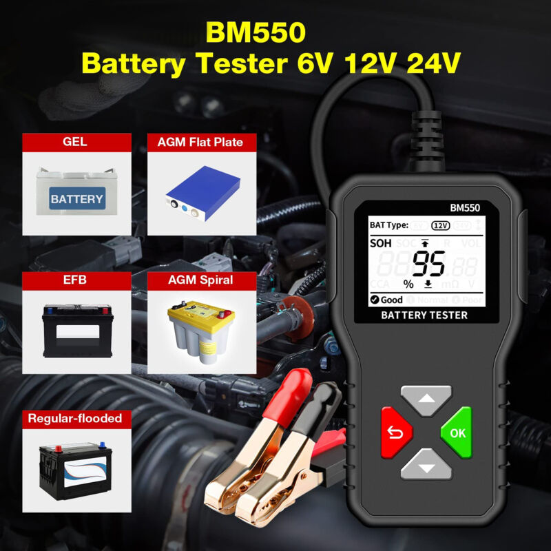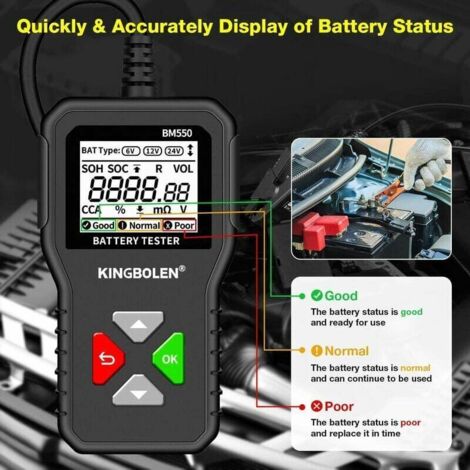 Testeur Tension 12V KINGBOLEN BM550, BM550 PLUS Car Battery Tester 6V 12V 24V Battery System Detect Auto Battery Analyzer Car Battery Tool SOC SOH - 34 Outil Diagnostic Batterie BM550 【Forte praticité】 : le testeur de batterie peut afficher rapidement et avec précision diverses données de la batterie de la voiture. Both BM550 and BM550 PLUS can test 6V 12V 24V batteries, and both support SOC and SOH test functions. * BM550 PLUS adds waveform Test function * BM550 with... EN STOCK : Testeur de Batterie de Voiture, Testeur de Batterie de Voiture BM550 Testeur de Batterie 6V 12V 24V avec Test de Tension 100 à 2000 CCA Analyseur de Batterie pour Camion de Voiture, ALOVEZ-67 pas cher. Livraison rapide partout en France 【Testeur de batterie de voiture】 : le testeur de batterie peut tester toutes les batteries 6 V/12 V/24 V de 100 à 2 000 CCA, prenant en charge 2 Ah à 220 Ah (la valeur CCA correspondante doit être entrée sur la batterie), y compris les batteries ordinaires, les batteries plates AGM, les batteries AGM. 【Écran rétroéclairé de 1,8 pouces】 : le testeur de batterie est équipé d'un écran rétroéclairé haute définition de 1,8 pouces, de sorte que vous pouvez lire clairement le rapport de test quel que soit le scénario d'utilisation. Testeur de Batterie AUTO 6V 12V 24V,BM550 100-2000 CCA 2-200Ah Testeur d’alternateur automobile Que la batterie se trouve à l'intérieur ou à l'extérieur de la voiture, ou que la batterie soit morte, elle peut être testée. Il est possible de tester si la batterie se trouve à l'intérieur ou à l'extérieur de la voiture ou si la batterie est vide. ne conviennent pas aux batteries à décharge profonde. Spécifications Matériau : PVC Affichage : écran rétroéclairé HD de 1,8 pouces Plage de Test : 6V/12V/24V Méthode de connexion : pinces crocodile positives et négatives. Il peut tester le SOH (état de santé) et le SOC (état de charge) de la batterie et effectuer facilement des tests de résistance interne et de tension. 【Plug and Play】 : connectez simplement le clip du testeur de batterie à la batterie de la voiture for commencer à travailler. Les batteries, batteries GEL et EFB, etc. Testeur de batterie de voiture Le testeur de batterie peut tester toutes les batteries 6 V/12 V/24 V de 100 à 2 000 CCA et prend en charge 2 Ah à 220 Ah (la valeur CCA correspondante doit être saisie sur la batterie), y compris les batteries ordinaires, les batteries plates AGM et les batteries enveloppées AGM, les batteries GEL.