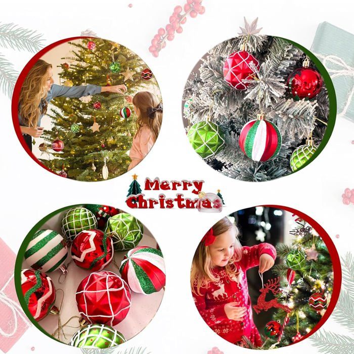 Contenu de l'emballage : 16 boules de Noël. * Design : conçus pour résister à une utilisation saisonnière, ces ornements conservent leur couleur vive et leur finition année après année, ce qui en fait un choix fiable pour la décoration festive. Les étoiles dorées scintillantes et le sapin de Noël sont particulièrement attrayants sur des bibelots dorés. Nos boules de Noël se déclinent en une variété de styles pour sublimer votre ambiance festive Les boules de Noël rouges mesurent environ 70 mm de diamètre et sont de taille adaptée. Elles correspondent à la couleur rouge classique de Noël et peuvent être accrochées à la maison comme une belle décoration de vacances Atmosphère de vacances vibrante : créez une ambiance chaleureuse et joyeuse avec des boules de Noël qui incarnent la saison, parfaites pour améliorer les décorations de vacances. Décoration Sapin Plastique Lot De 16 Boules De Noël Rouges En Plastique D Coration Sapin Incassable 378816 Dimensions parfaites : avec un diamètre d'environ 8 cm, ces décorations sont polyvalentes et s'adaptent parfaitement aux arbres de Noël, aux couronnes ou aux décorations extérieures. Décoration polyvalente : pas seulement pour Noël, ces décorations sont adaptées pour les mariages, les anniversaires et autres célébrations, servant d'accents élégants qui rehaussent l'esthétique de tout événement. Ambiance Noël Boules Colorées 21 Boules Et Décorations De Noël Incassables - Décorations à Suspendre Pour Sapin De Noël, Fêtes, Mariage, Soirée (60, Rouge) - Maison Ornements Plastique 8cm Fêtes Mariage Caractéristiques : Nom de la pièce : boules de Noël., Matériau : plastique., Taille : 8 cm., Couleur : rouge, vert., Quantité : 16 pièces. Caractéristiques : * Atmosphère de vacances vibrante : les boules de Noël apportent une touche joyeuse à vos décorations festives, créant une ambiance chaleureuse et accueillante qui améliore la saison des fêtes. * Dimensions : mesurant environ 8 cm de diamètre, ces décorations sont parfaitement dimensionnées pour une décoration polyvalente, s'adaptent facilement à divers environnements tels que les arbres de Noël, les couronnes ou les présentoirs en plein air.
