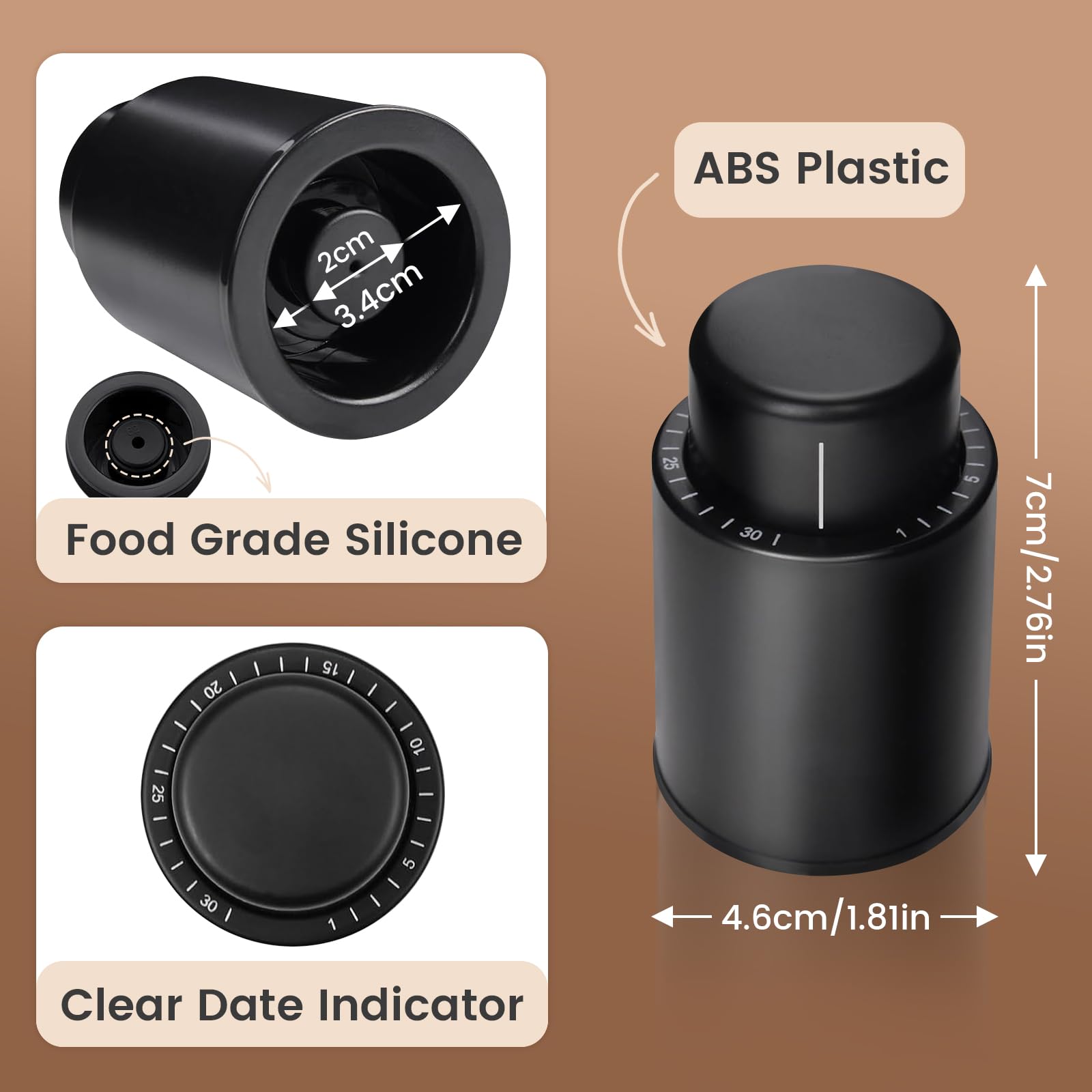 Utilisations Multiples : idéal pour les fêtes, les rassemblements, les restaurants, les clubs, les bars, et un cadeau parfait pour les amateurs de vin. Bouchons de bouteille de vin, véritables bouchons de vin sous vide Gimars 4 Pcs Bouchons de Bouteille Vin sous Vide pour Champagne/Vin, Pompe à Vide à Vin avec Échelle de Temps, Bouchon Vin Vide Air Réutilisable, Meilleur Cadeau pour Les Amateurs de Vin Convient à La Plupart Des Bouteilles De Vin Standard : convient à la plupart des bouteilles de vin rouge et blanc (ne convient pas au champagne et au vin mousseux). Remarque : les bouchons sont étanches, mais pour ne pas boucher les petits trous des bouchons qui servent à évacuer l'air, nous recommandons de conserver le vin en position verticale en utilisation. Fonctionnement simple et rapide] Il suffit de placer le bouchon de vin dans le goulot de la bouteille, de placer la pompe à vide sur le bouchon et de continuer à tirer de haut en bas, de pomper et de pomper jusqu'à ce que vous sentiez une énorme résistance qui vous oblige à vous arrêter Il est recommandé de les utiliser dans les 5 jours pour les vins rouges et dans les 3 jours pour les vins blancs. Gardez Le Vin Frais Longtemps : le bouchon à vin sous vide est capable de garder le vin frais pendant plusieurs jours en pompant l'air dans la bouteille et en conservant l'arôme et la saveur de la bouteille ouverte ; le scellement solide empêche le vin de fuir même lorsque la bouteille est placée à l'horizontale. Accessoire Vin Pour Amateur Boîte ABS 5 Pièces - Bouchon De Bouteille De Vin, Pompe À Vide, Pour Kit 4 Bouchons Silicone ABS Alimentaire
