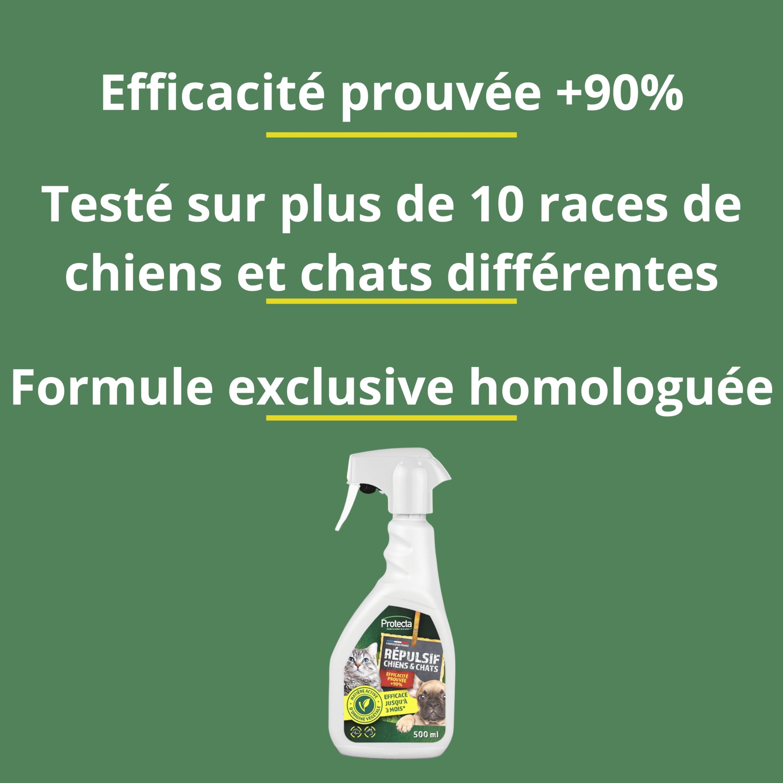 Granulés Anti Marquage Urinaire Protecta® - Granulés Répulsifs Chiens & Chats 400g – Anti-Griffures & Marquages Urinaires – Efficacité Prouvée 90% – Protection Jusqu’à 3 Mois – Tous Repousse Chien Chat Extérieur Utiliser 30 grammes de granulés (soit 3 dosettes) pour 1 m². FORMULE PUISSANTE & INNOVANTE – Repousse efficacement les animaux grâce à son action olfactive renforcée, tout en prévenant les comportements indésirables. Mais son engagement ne s’arrête pas aux espaces verts. Le premier répulsif chiens, chats vendu sous autorisation européenne. Utiliser 30 grammes de granulés pour 1 m². MODE D’EMPLOI SIMPLE & PRÉCIS – Epandre les granulés par temps sec sur tout type de surfaces extérieures (aux alentours des endroits à protéger des animaux comme les volières, parterres de fleurs, jardinières, potagers). FABRICATION FRANÇAISE – Produit conçu et fabriqué en France, garantissant une qualité supérieure et répondant aux normes environnementales. L’efficacité du produit est maintenue jusqu’à 3 mois. Répulsif pour chiens et chats Panic 500ml - Protecta - 11,35 € - Protecta - SRL Les animaux, incommodés par l’odeur sans toutefois impliquer un effet néfaste sur leur bien-être, vont dès lors délimiter leur territoire ailleurs que dans la zone ciblée. Subito - Répulsif Chiens et Chats granulés pour l'extérieur - 1kg Protecta offre également des solutions pour sécuriser votre intérieur et protéger vos animaux de compagnie contre les nuisibles tels que les rongeurs et les insectes envahissants. Ne pas appliquer à proximité immédiate des cours d’eau. À BASE D’HUILES ESSENTIELLES – Formulé à base de matières actives d’origines végétales (huile essentielle de menthe poivrée, de lavande et d’acide acétique) Une Protection Complète, du Jardin à la Maison La mission de Protecta est d'accompagner tous les passionnés de nature, du jardinier amateur au professionnel, en proposant des solutions adaptées à chaque étape du cycle de vie du jardin. Spécialiste de la lutte anti-nuisibles, la marque Française propose une large gamme de produits, allant des solutions naturelles aux méthodes plus conventionnelles, afin de garantir une protection efficace et durable. Grâce à une combinaison de pièges à phéromones, d'auxiliaires, d'insecticides et de rodenticides, la marque répond efficacement aux problématiques de lutte contre les nuisibles, tout en privilégiant des alternatives écologiques. Protection de 6 à 7 points de marquage (200G) ou 13 à 14 points de marquage (400g) Efficacité prouvée jusqu'à 3 mois (pas de retour de l'animal observé) Contact testé sur tous types de sols extérieurs. Formule exclusive homologuée Dans ce cas, procéder à une nouvelle application du produit dans la limite d'une application par semaine. RÉPULSIF EFFICACE POUR CHIENS & CHATS – Éloigne les chiens et chats de leurs points de marquage habituels, empêchant marquages urinaires, griffures et détériorations.
