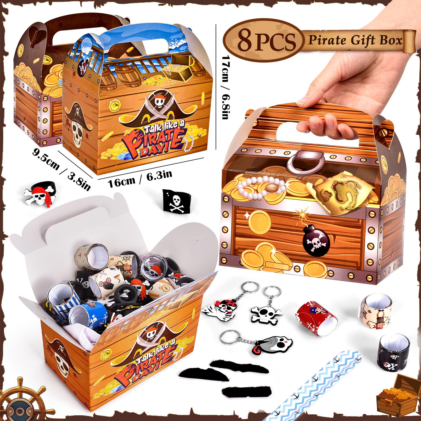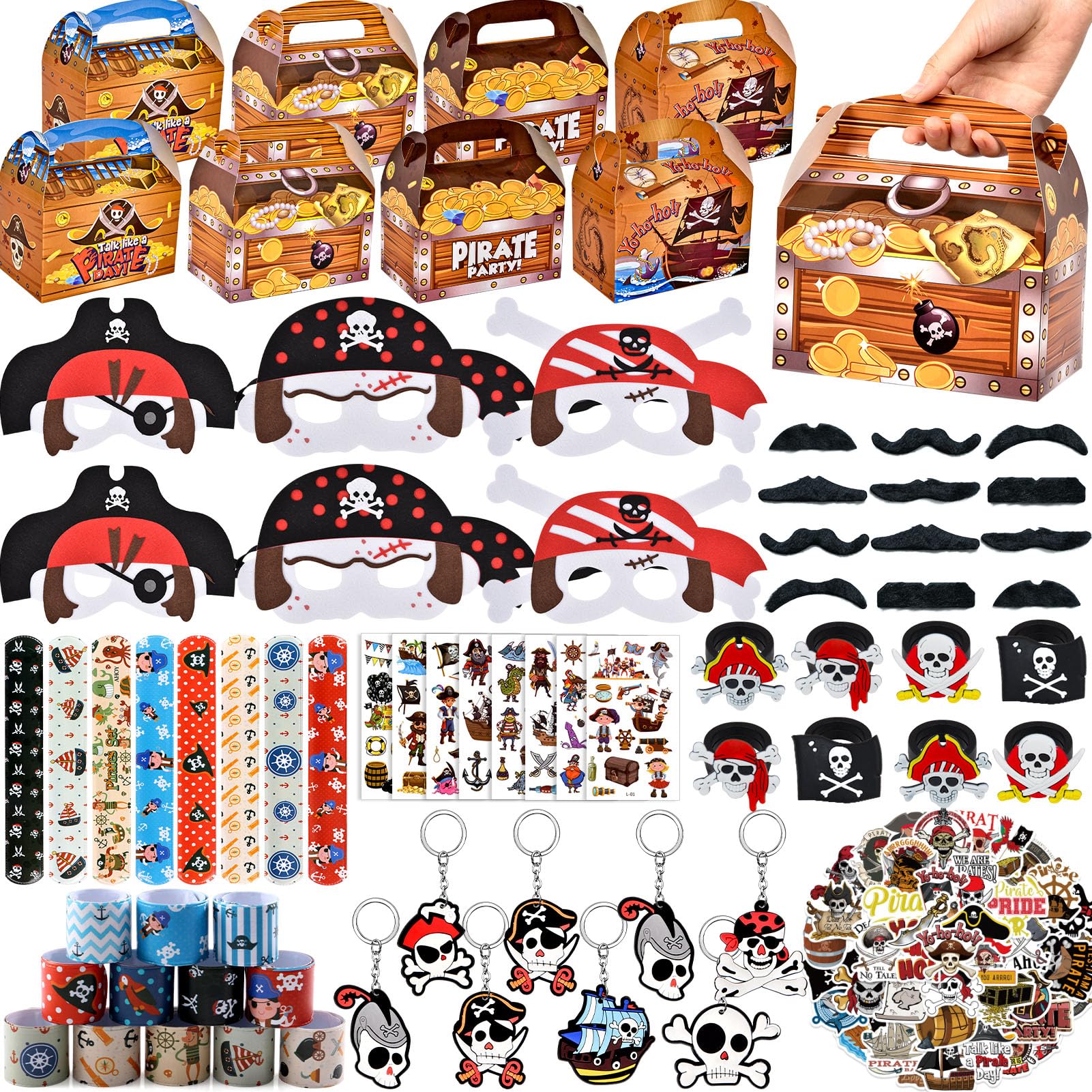 Cadeaux de fête pirate complets : Ce coffret comprend 12 carnets de pirate (10×6 cm, 16 pages), 12 cache oeil pirate enfant en feutrine épaisse, 12 drapeau pirate enfant en tissu Oxford, 12 bracelets pirates à claquer et 12 planches de tatouage pirate enfant. Marin, pirate, capitaine, boucanier ou garçon de cabine, la fête d'anniversaire thème pirate est faite de chapeaux de pirate, de maquillage de pirate, de pièces d'or issues d'un trésor ou encore des tatouages de pirate. À l'abordage Plongée dans l’univers des pirates : les accessoires emblématiques rendent les jeux de rôle plus immersifs pour les enfants. Large utilisation : Idéal pour les fêtes d’anniversaire, les activités scolaires, les récompenses en classe, les animations de kermesse ou comme petit cadeau de Noël et Pâques. Les carnets de pirate et les tatouages complètent parfaitement le thème, créant une atmosphère de trésor et d’aventure qui séduira tous les enfants. Expérience interactive et amusante : Les drapeaux et les bracelets à claquer ajoutent une touche d’action et de jeu aux fêtes. Ce cadeau pinata pirate favorise l’interaction entre enfants et stimule leur imagination dans des jeux de rôle passionnants. Coffret thème pirate pour une idée cadeau pas comme les autres Activités interactives et amusantes : les drapeaux à agiter et les bracelets slap favorisent la participation active. Un Anniversaire Pirate Inoubliable - Idées et Astuces Cache Oeil Drapeau Pirate 51 PCS Anniversaire Pirate Cadeau, Décorations De Fête De Pirate, 5 X Tatouage De Pirate Bracelets Tatouages Temporaires Tout le nécessaire pour amuser 12 enfants lors d’un anniversaire ou d’une activité scolaire. Conçu pour les enfants : matériaux sûrs, confortables et durables, faciles à manipuler. Polyvalent : idéal pour fêtes d’enfants, écoles, ateliers créatifs ou comme cadeau surprise. Avertissement De Sûreté Le bracelet à boucle contient une tôle d'acier élastique. Veuillez le boucler uniquement dans le sens indiqué et ne pas le plier dans la direction opposée.