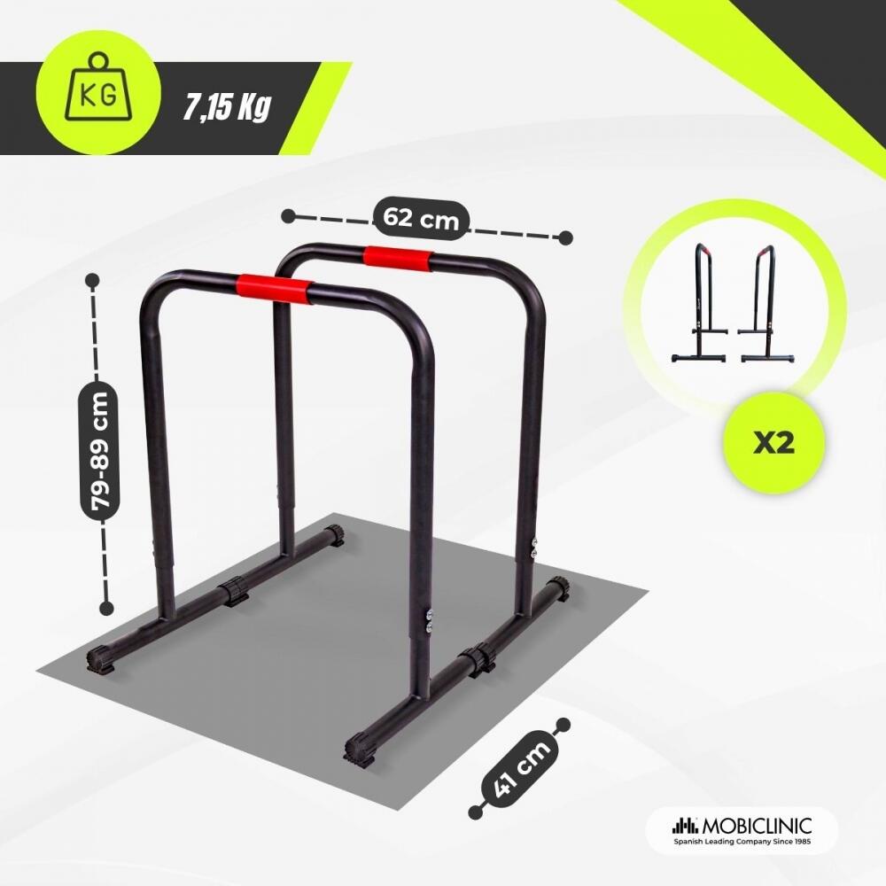 Les barres parallèles de callisthénie Twins sont conçues pour offrir une stabilité et un confort optimaux pendant vos entraînements. HAUTEUR RÉGLABLE : Ces parallettes calisthenics offrent deux réglages de hauteur (79 cm et 89 cm), s’adaptant aux besoins de chaque utilisateur et à une grande variété d’exercices, notamment les dips, les pompes, la planche, la callisthénie et l’entraînement fonctionnel Leur cadre en acier renforcé supporte jusqu'à 120 kg et est réglable en hauteur (79 et 89 cm), avec des poignées rembourrées et des pieds antidérapants en caoutchouc. Sa texture antidérapante vous permet de maintenir une technique précise et un contrôle total pendant les exercices Ces protections empêchent les glissements et protègent le sol des rayures et des bruits gênants , ✔️MOBICLINIC S., L. équipement Musculation Fonctionnel GORILLA SPORTS® Barres Parallèles - Paire, Hauteur 73 Cm, Charge Max 200kg, Acier Haute, Noir/Bleu/Rouge - Station De Dip Parallettes, Dips Stand, Calisthenics, Push Up Bars, Musculation, Fitness, Gym Barres Stables Son système de réglage rapide vous permet de varier l’intensité de vos entraînements et d’améliorer votre force, votre équilibre et votre endurance 💪 STRUCTURE ROBUSTE ET STABLE : Ces barre dips peuvent supporter jusqu’à 120 kg, offrant stabilité et sécurité lors d’exercices intenses. Sa conception équilibrée empêche tout balancement ou mouvement indésirable, garantissant une sécurité accrue à chaque répétition. 🖐️ PRISE EN MAIN CONFORTABLE ET ANTIDÉRAPANTE : Les Barres Parallèles sont dotées de poignées recouvertes de mousse haute densité pour une prise en main douce, confortable et sûre. Herrselsam Poignée murale pour toilettes - Support de WC réglable en hauteur - Avec poignées en Ce matériau empêche les glissements et protège vos mains des frottements. Les barres parallèles Mobiclinic ont été conçues avec une structure en acier robuste pour garantir un soutien et une stabilité professionnels tout au long de vos entraînements. Cet équipement est le complément idéal pour les routines intenses, offrant une sécurité optimale et une capacité de charge allant jusqu'à 120 kg