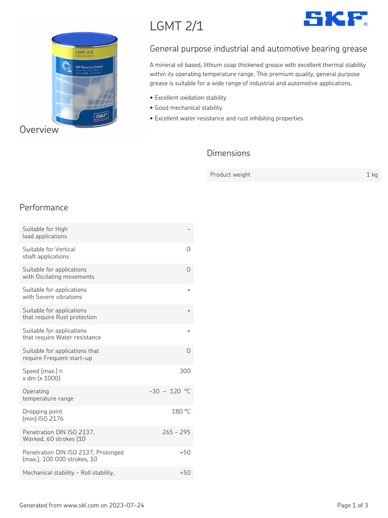 Roulement de roue automobile., Dispositifs de roulement., Petit moteur électrique. À mélanger uniquement avec des graisses de lubrification identiques. Cartouche de graisse LGMT2-420ML-SKF | Le Bon Roulement Découvrez toutes les informations sur le produit : graisse lubrifiante LGMT 2 series de la société SKF. Contactez un fournisseur ou directement la maison mère pour connaître le prix, obtenir un devis et découvrir les points de vente près de chez vous de/infomaterial/lgmt2_sicherheitsdatenblatt., pdf LGMT 2/1 | Graisse Huile minérale SKF LGMT 2, Boîte de 1 kg | RS Contenu de la livraison : 1 KG. Température : de -30 ° C à +120 ° C. Graisse Mecanique Cartouche De Graisse LGMT2-1KG-SKF | Le Bon Roulement Température -30°C à +120°C Résistance Eau Cas d'utilisation types Machines agricoles. Elle a une excellente résistance à la chaleur dans la plage de température spécifiée (-30°/+120°)., SKF LGMT 2/0., 4 est une graisse multi-usage pour les petits et moyens roulements et autres dispositifs., Hautement hydrofuge. Convient pour une utilisation intensive.