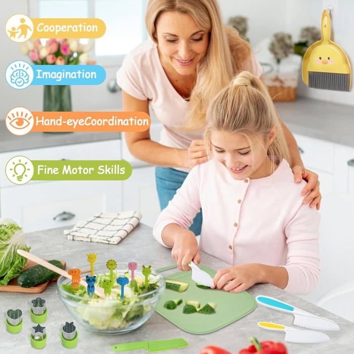 Couteau pour fromage ondulé 18x5cm – Kämpf Fournitures Laitières Sàrl Tous les éléments sont solides, sans échardes et sûrs pour les tout-petits – parfaits pour leurs premières expériences de découpe de fruits et légumes à la maison. Couteau Cuisine Enfant Neuytiky 15 Pièces Couteau De Cuisine Pour Enfants, Kit Couteau De Planches à Découper Les 15 ustensiles de cuisine pour enfants inclus sont : 4 couteaux de cuisine pour enfants, 1 couteau ondulé, 1 couteau en bois cartoon, 1 éplucheur, 1 outil de découpe en forme d’ours, 4 emporte-pièces, 1 planche à découper, 1 tablier enfant et 1 panier de rangement En coupant eux-mêmes, les enfants expriment leur créativité et développent leur motricité fine – un incontournable de l’éducation culinaire adaptée aux enfants. ✅【Utilisation polyvalente – à la maison, à l’école ou en atelier】 Que ce soit dans la cuisine familiale, à la maternelle ou en cours de cuisine, ce 15 Pièces Couteau de Cuisine pour Enfants constitue un jouet éducatif précieux. Un ensemble de 15 couteaux en bois polyvalent et de haute qualité pour les enfants qui garantit plaisir et sécurité lors de la cuisson. Ensemble de couteaux sûr... Wave Knife Français Frites Couper Couteau Ondulé Nouilles Couteau Creatif Pomme De Terre Outils De Cuisine ✅【15 Pièces Couteau de Cuisine pour Enfants – Sécurité maximale avec plastique alimentaire sans BPA】 Ce 15 Pièces Couteau de Cuisine pour Enfants associe acier inoxydable, bois et plastique alimentaire sans BPA. ✅【Ergonomique et adapté aux enfants – conçu pour les petites mains】 Les couteaux sont équipés de poignées ergonomiques au design ludique (crocodile) et de lames dentelées arrondies. ✅【Kit Couteau de Cuisine pour Enfants 15 pièces en bois – tout ce qu’il faut pour les petits chefs】 Ce Kit Couteau de Cuisine pour Enfants 15 pièces comprend 4 couteaux de cuisine pour enfants, 1 couteau ondulé, 1 couteau en bois avec motif cartoon, 1 éplucheur, 1 outil de découpe en forme d’ours, 4 emporte-pièces, 1 planche à découper, 1 tablier enfant et 1 panier de rangement.