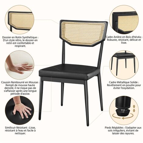 Ce design épuré se fond facilement dans diverses ambiances décoratives. ✅ Matériaux premium – Structure en métal thermolaqué ultra-résistante + rotin PE tissé main pour une durabilité exceptionnelle. ✅ Montage facile – Assemblage rapide et sans outils avec notice illustrée claire. Les étapes d'assemblage sont clairement expliquées, et une fois montées, les chaises sont prêtes à être utilisées dans votre espace, offrant à la fois confort et élégance en un rien de temps. Ce matériau résistant permet de maintenir une posture fraîche et aérée, tout en étant facile à entretenir. Lot 2 Chaises Modernes Lot De 2 Chaises De Salle à Manger, Chaise De Cuisine, Dossier En Rotin Chaise De Salon Pu Couleur Bois Chaise Rembourrée Confortable Le rembourrage doux permet de profiter d'un confort de longue durée, que ce soit lors d'un repas en famille ou d’un moment de détente. 【Structure Solide et Capacité de Charge Maximale】La structure en métal renforcé de ces chaises assure une grande stabilité et une excellente résistance. 【Design Élégant et Moderne】Le lot de 2 chaises de salle à manger modernes avec dossier en rotin et pieds en métal est idéal pour ajouter une touche contemporaine à votre intérieur. 【Matériaux de Haute Qualité】Le dossier des chaises est fabriqué en rotin PE tissé à la main, ce qui garantit leur robustesse et leur durabilité. Chaise, banc et tabouret - Page 3 Caractéristiques : ✅ Design moderne & élégant – Lot de 2 chaises au style contemporain avec dossier en rotin et pieds en métal, parfait pour salle à manger, cuisine ou salon., Dimensions compactes (48×46., 5×80., 5 cm, hauteur d’assise 45., 5 cm). Ces chaises sans accoudoirs conviennent parfaitement aux salles à manger, cuisines et salons, offrant une esthétique raffinée et minimaliste., Dimensions : P 48×L 46., 5×H 80., 5cm - Hauteur d'assise : 45., 5cm. Le dossier en rotin assure également une bonne ventilation, garantissant une expérience agréable, même pendant de longues périodes. Spécifications: Couleurs:Beige / Noir Matériaux:Rotin PE + Métal + Coussin rembourré Dimensions Chaise : L 48 × P 46,5 × H 80,5 cm Hauteur d'assise : 45,5 cm Dimensions de l'assise ronde : L 48 × P 46,5 cm Capacité de charge:120 kg Poids net:8,5 kg par chaise Caractéristiques:Respirant、Design élégant、Confort optimal Contenu du colis : 2 x Chaises de salle à manger 1x Notice de montage illustrée Magasinez notre sélection de Chaises de salle à manger dans la section des Mobilier de salle à manger et de cuisine dans le rayon Decor chez Home Depot Canada Lot de 2 chaises LEA - Assise tissu taupe et dossier cannage 【Confort Ergonomique】Ces chaises sont conçues pour épouser parfaitement les courbes du corps, offrant un confort optimal grâce à leur siège rembourré et leur dossier ergonomique.