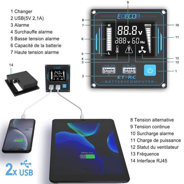 Convertisseur 12v 220v 2000w Convertisseur Pur Sinus EDECOA 2000W - Onduleur 12V Vers 220V Avec Télécommande Et écran LCD, Parfait Pour Camping- car Et Autonome Convertisseur Pour Camping Car Batterie 12V PROTECTION MULTIPLE INTELLIGENTE ✔ Alarme sonore + LED clignotante en cas de surchauffe/surtension ✔ Régulation automatique (AVR) et gestion de puissance IPM ✔ Écran LCD diagnostique (affiche 15+ codes erreur spécifiques) Découvrez notre nouvelle télécommande avec 2 ports USB, conçue pour vous permettre de contrôler facilement votre installation et de connecter vos périphériques USB, tels que des téléphones portables et des tablettes Les meilleures offres pour EDECOA 2000W Convertisseur 12V 220V Pur Sinus Onduleur Inverter USB Type C sont sur Comparez les prix et les spécificités des produits neufs et d'occasion Pleins d'articles en livraison gratuite Livré avec : câbles de connexion + bornes de sécurité + télécommande Fonctionnalités Intelligentes Écran LCD : contrôle de la batterie (tension et % restant) REFROIDISSEMENT SILENCIEUX ✔ Ventilateurs <25dB (déclenchement seulement à 45°C) ✔ Carcasse aluminium aérodynamique (dissipation optimale) Convertisseur Tension Camping EDECOA Onduleur 2000W 24V Vers 230V - Convertisseur Sinusoïdal Modifié Avec Télécommande Convertisseur 24v 220v Camion Corps en aluminium résistant à la chaleur et à l'humidité Protection Intégrale Multicouche Protections contre : surtensions, sous-tensions, surchauffe (45°C) et surcharges. Technologie Haute Performance (SPWM) Sortie 230V Pur Sinus (compatible appareils sensibles : médical, électronique) Bateaux / zones sans réseau électrique Installation Simplissime (Tout Inclus) Idéal pour : Camping-cars / fourgons aménagés, Installations solaires autonomes Refroidissement Optimisé Ventilateur silencieux activable dès 45°C 2 Ports USB (1x Type-A + 1x Type-C) pour recharger smartphones/tablettes Affichage clair du défaut sur l'écran LCD