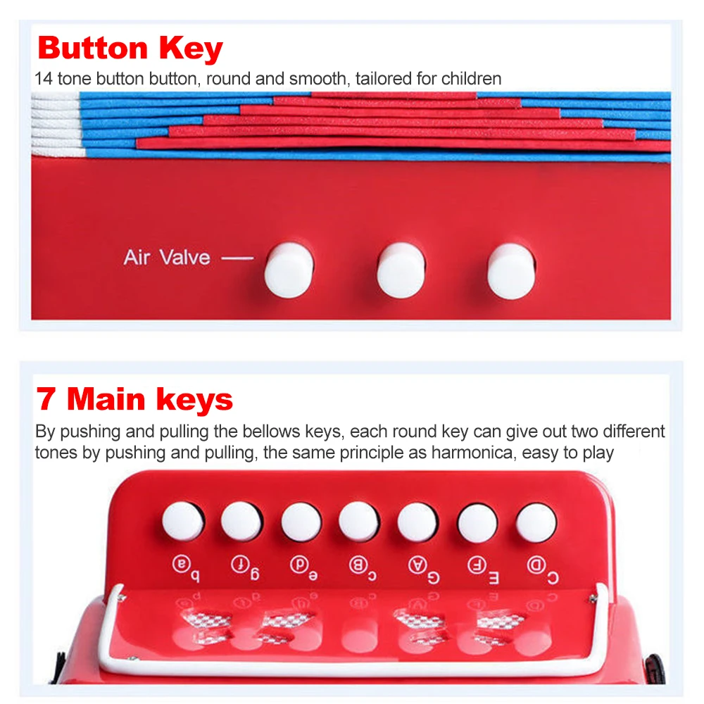 * 【Outil d'apprentissage à 7 touches】 : L'accordéon à boutons dispose de sept touches pour enseigner la théorie musicale de base et simple, idéal pour la pratique fondamentale * 【Idéal pour les débutants】: Conçu pour les débutants et les enfants, cet accordéon pour enfants à 7 touches est facile à apprendre, aidant les débutants à acquérir rapidement des compétences musicales tout en favorisant l'amour de la musique * 【Matériau de qualité supérieure】: accordéon pour enfants est fabriqué en polypropylène robuste pour une utilisation à long terme tout en restant léger et pour les jeunes joueurs Portable A Touche Accordéon Jouet Musical Instrument De Musique Enfant 3 Ans Accordéon Polypropylène Léger Initiez les enfants au monde de la musique avec cet accordéon jouet à 7 touches. Conçu pour les petites mains, il est idéal pour éveiller l'intérêt musical des tout-petits et des débutants Enfants 7 touches 2 basses Mini petit accordéon éducatif jouet... Sews-mini petits enfants clavier accordéon rythme ... - Grandado