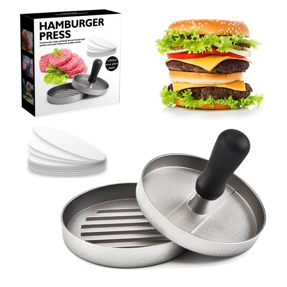 12 cm Hamburger ve börekler Maker Burger Hamburger presi et presi tencere et iti Presse Burgers Rainurée Juteuse Press For Smash Burgers Presse à Hamburger - Acier Inoxydable Presse à Burger Professionnelle Maison 【Application Multi-scénarios】Conçu pour la cuisine, le barbecue dans l'arrière-cour et le pique-nique en plein air, c'est l'assistant idéal pour les dîners en famille et les barbecues entre amis, et il peut facilement faire face à différents scénarios de cuisson Presse à hamburgers professionnelle - Permet de presser facilement des galettes de hamburgers juteuses dignes d'un restaurant ! Camping, barbecue avec pression de burger, viande crue sur le site de pressage de moulage, éliminant la nécessité de pincer manuellement la viande de l'ennui, mais aussi d'interagir avec des amis « DIY Exclusive Burger » ! Quelles sont les meilleures presses à steak haché et burger en 2025 ? Pour préparer des steaks et des burgers savoureux, l’idéal reste encore d’utiliser une presse à viande hachée. C’est en effet un produit très pratique qui permet de former rapidement et facilement de beaux steaks bien réguliers 【Taille de la Presse à Hamburger】La presse à hamburger a un diamètre de 12 cm (environ 4,7 pouces), ce qui permet de créer facilement des galettes de hamburger de qualité professionnelle, de taille et d'épaisseur uniformes Découvrez comment choisir la presse à burger idéale pour un façonnage rapide et uniforme de vos steaks hachés en toute simplicité 【Amélioration de la Qualité des Hamburgers】La galette est ferme et ne se désagrège pas facilement, elle est chauffée plus uniformément, ce qui permet d'emprisonner parfaitement les jus de viande lors de la friture, pour obtenir un hamburger parfait à l'aspect attrayant et au goût juteux Taille standard : le diamètre de 12 cm convient à la plupart des galettes de hamburger et produit des galettes de taille régulière qui remplissent parfaitement le pain.