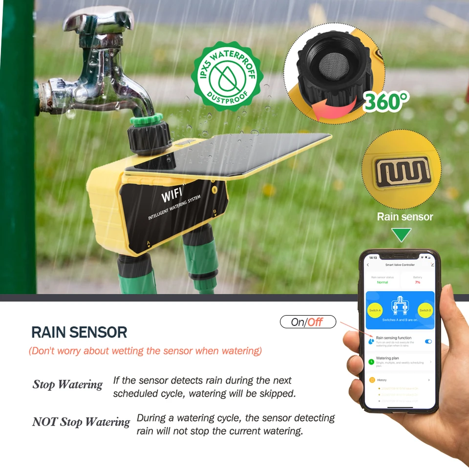 * Dimensions : 17 x 12 x 5 cm. * Technologie de capteur de pluie : équipé d'un capteur de pluie intégré, ce système d'irrigation interrompt automatiquement l'arrosage par temps pluvieux, préservant l'eau et évitant un arrosage excessif, tout en permettant une activation manuelle lorsque l'arrosage immédiat est nécessaire. Kit d'arrosage avec capteur de pluie et accessoires | Programmateurs et compteurs Contrôlez votre système d'arrosage du bout des doigts grâce au minuteur Wi-Fi d'arrosage intelligent de Rain Bird. Le paramétrage de votre calendrier d'arrosage... Contrôle intelligent de l'application : le minuteur d'irrigation pour votre maison WiFi en utilisant l'application pour des programmes d'arrosage personnalisés et des journaux d'activité, de sorte que votre jardin reste hydraté même lorsque vous êtes absent. RAINPOINT Compteur d'irrigation WiFi, minuteur d'eau Intelligent Chargement solaire et USB : options d'alimentation flexibles avec un panneau solaire réglable pour maximiser la capture de la lumière du soleil ou une connexion USB pour les configurations ombragées ou intérieures, s'adaptant facilement aux différentes configurations et climats de jardin. Large application : s'adapte aux tuyaux d'arrosage standard 3/4 ou 1/2 avec un connecteur rotatif à 360°, ce qui rend cet arrosage automatique Prise Programmable Wifi Johgee Programmateur Arrosage WiFi, Minuterie D'Arrosage APP, Arrosage Automatique, Contrôleur Irrigation, Délai De Pluie, Intérieur Et Extérieur Universel Programmateur D'arrosage Wifi * Programmation d'arrosage programmable : l'application vous permet de définir des temps d'arrosage précis allant de 1 seconde à 3600 secondes les jours, vous permettant de personnaliser votre routine d'irrigation pour répondre aux besoins spécifiques de votre jardin ou pelouse. Caractéristiques : * Connectivité : cette irrigation se connecte de manière transparente à votre réseau domestique via l'application pour SMARTLIFE, vous permettant de créer des programmes d'arrosage personnalisés et de surveiller l'historique d'arrosage depuis n'importe où, fournissant à vos plantes la bonne quantité d'eau même lorsque vous êtes absent. * Chargement solaire et USB : conçu pour être polyvalent, ce système peut être alimenté par un panneau solaire réglable, qui peut être positionné pour capturer efficacement la lumière du soleil, ou alternativement connecté via un câble USB pour une utilisation en intérieur, offrant une flexibilité pour s'adapter à différents environnements.