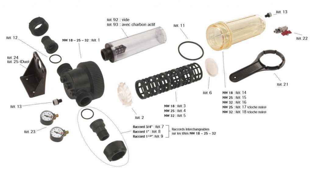 Voici les principales utilisations d'un filtre anti impuretés CINTROPUR NW32 TE 11/4 :Filtration d'eau potable : Le filtre est utilisé pour éliminer des substances indésirables de l'eau telles que le calcaire, les métaux lourds, le chlore, les pesticides et d'autres substances présentes dans l'eau de distributionFiltration agricole : Sert de filtre pour les eaux d'arrosage ou d'abreuvage pour les animauxLes caractéristiques techniques du filtre à eau cintropur :Seuil de filtration : sansSurface de filtration : sansPays de fabrication : BelgiqueDébit : 0,5 m3/ pièce détachée de remplacement originale, tête de filtre CINTROPUR nue Le filtre Cintropur NW32 TE 1’’ 1/4 contribue à protéger les circuits hydrauliques et l’ensemble des appareils qui y sont branchés. Le filtre retient les éléments solides présents dans l’eau, comme la rouille, le sable ou la terre Grâce au mécanisme interne du filtre, le temps de contact entre l?eau et le produit filtrant sera maximum, ce qui garantit une efficacité optimale du traitement. En effet, le porte filtre est vide et peut accueillir une charge de filtre contenant par exemple du charbon actif ou du polyphosphate. Le Filtre Cintropur NW32 TE - 11/4est un produit essentiel pour filtrer l'eau de distribution pour les particuliers comme pour l'industrie. Entièrement fabriqué à partir de matière première synthétique de haute qualité, il est certifié ACS et garanti conforme avec de l'eau à destination de la consommation humaine Les avantages du filtre à eau rechargeable AW1032Traitement efficaceRechargeable permet de choisir votre filtrationDurabilité : grâce à sa conception, le filtre peut s'utiliser pour plusieurs applicationsInstallation facile : il est conçu pour une installation simple et rapideMaintenance facile : équipé d'un système de nettoyage par purgeNW32 TE Filtre cintropur rechargeable pour traitement de l'eauLe filtre à eau CINTROPUR peut s'utiliser pour de multiples applications, grâce à sa conception, le filtre TE peut accueillir une cartouche au charbon actif, au polyphosphate ou au silicophosphate., ., ., pour s'adapter à votre besoin en traitement de l'eau. Filtre à eau rechargeable NW32 TELe filtre rechargeable cintropur est conçu pour vous offrir une solution de filtration adaptée à vos besoins. Installation Facile Purge Intégrée Catégorie Filtre Cintropur Gros Débit - POMPES H2O : Filtre CINTROPUR Filtre Polyphosphate