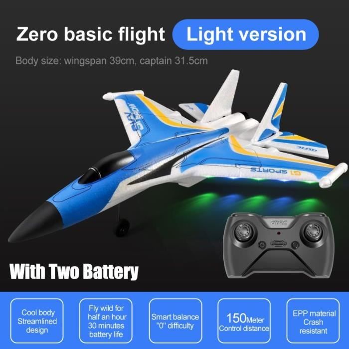 Distance de la télécommande : 150 mètres Altitude des vols : 150 mètres Liste de colisage: ensemble avion télécommandé x1 Remarques : 1., En raison des différents effets de moniteur et de lumière, la couleur réelle de l'article peut être légèrement différente de la couleur montrée sur les images., 2., Veuillez pardonner un léger écart de mesure dû à la mesure manuelle. Pile de la télécommande : AA x 3 Parfait pour les et les débutants, il peut même voler dans des environnements légèrement humides. Conception en silicone anti-collision : grâce à sa conception en silicone anti-collision, cet avion télécommandé a une capacité améliorée à résister aux collisions, réduisant les dommages et protégeant la structure principale de l'avion. Doté d'une puissance de sortie plus élevée, d'une technologie avancée de télécommande de 2,4 GHz et de dommages structurels réduits. CHT RC avion télécommandé avion télécommandé jouet Bleu YS002 14574 Transmission de signal fiable : avec un système de télécommande de 2,4 GHz, bénéficiez d'une transmission de signal stable sans interférence d'autres appareils électroniques. Profitez d'une maniabilité de vol sans effort Chez Flash RC, spécialiste du modélisme depuis plus de 20 ans, nous vous proposons une large sélection d’avions RC (radiocommandés) adaptés à tous les profils : du pilote débutant qui cherche son premier avion télécommandé, jusqu’à l’expert passionné en quête de performance et de compétition Avion Double Moteur Télécommande Avion Télécommandé RC Avec Lumières LED Pour Enfant - Marque VGEBY Avion Télécommandé Extérieur LED Caractéristiques: Matériel: PPE Poids : 322g Taille du produit: environ 29x20,5x6,5 cm/11,42x8,07x2,56 pouces Batterie du corps : batterie rechargeable (batterie remplaçable) Pile de la télécommande : AA x 3 Méthodes de contrôle à distance : télécommande sans fil 2,4 G. Grâce à sa conception innovante, obtenir des performances optimales et une précision inégalée n'a été aussi simple. 56,99 € 40,71 € Ajouter Avion Télécommandé à Double Canal 2,4 GHz 3 canaux-VEVOR-Jouet d'avion Amphibie Prêt à Voler-pour Débutants, Adultes et Enfants Livraison gratuite1 45,99 € Ajouter Vivez le frisson de voler avec notre avion télécommandé ! Doublez le plaisir : doté d'une technologie de moteur à double moteur pour une puissance de sortie plus élevée, garantissant des performances de vol plus stables avec une puissance et une stabilité robustes Caractéristiques Matériel: PPE , Poids : 322g Amusement sans effort dans des conditions humides : améliorez votre jeu d'avion télécommandé avec des couleurs LED vibrantes et un design étanche.