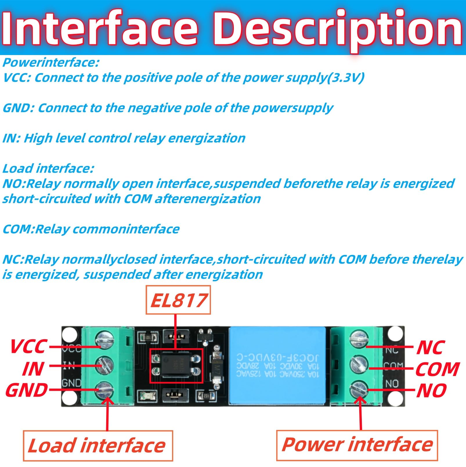 Module optocoupleur, supportant une charge AC 250V/10A ou DC 30V/10A, l'interface de relais NO/NC/COM peut être câblée de manière flexible. OMABETA Module de relais 1 canal 5pcs Module Relais 1 Canal Carte de Largement compatible, la carte d'interrupteur à relais adapte les signaux de contrôle DC 3V~3.3V pour ESP8266, ESP32, Arduino, Raspberry Pi et de nombreux microcontrôleurs Largement compatible, la carte d'interrupteur à relais adapte les signaux de contrôle DC 3V~3., 3V pour ESP8266, ESP32, Arduino, Raspberry Pi et de nombreux microcontrôleurs. JP2 : Connecte la borne de signal GND au relais V+ Dimensions : 70 × 17 × 20 mm (L × L × H) Indicateur : Indication par LED de la sortie du signal Protection : Protection contre le retour de diode (protection contre la roue libre) Adaptation : ESP8266, ESP32, NodeMCU, Arduino, Raspberry Pi, MCU Adaptation : ESP8266, ESP32, NodeMCU, Arduino, Raspberry Pi, MCU, série ARM/PIC/AVR. Module relais 1 2 4 8 canaux 5v avec optocoupleur. Sortie relais 1 2 4... Isolateur optocoupleur, utilisant l'optocoupleur EL817, fournissant une double entrée d'alimentation, améliorant la performance anti-interférence, pour assurer une transmission stable du signal. Spécifications : Nom du produit : 3V Single Channel Optocoupler Isolated Relay Module (High Level Trigger) Tension de fonctionnement : DC 3V ~ 3., 3V Signal de contrôle : Déclenchement à haut niveau (un signal d'entrée 1., 3V peut être déclenché) Puce d'optocoupleur : EL817 Modèle de relais : SRD-DC03V-SL-C Capacité de charge : AC 250V / 10A DC 30V / 10A Temps de réponse : Durée de vie : ≥ 100 000 fois la durée de vie mécanique Type d'isolation : isolation par optocoupleur (pour améliorer la capacité anti-interférence) Interface : Interface de signal : VCC (3,3 V positif), GND (négatif), IN (entrée de signal) Interface de relais : NO (normalement ouvert), COM (commun), NC (normalement fermé) Capuchon de cavalier Fonction : JP1 : Connecte la borne de signal VCC et le relais V+. Optocoupleur 3v ROUHO 8 Canal 3.3 V Module De Relais Optocoupleur Pilote Relais Carte De Contrôle Bas Niveau Pour Arduino Module Relais