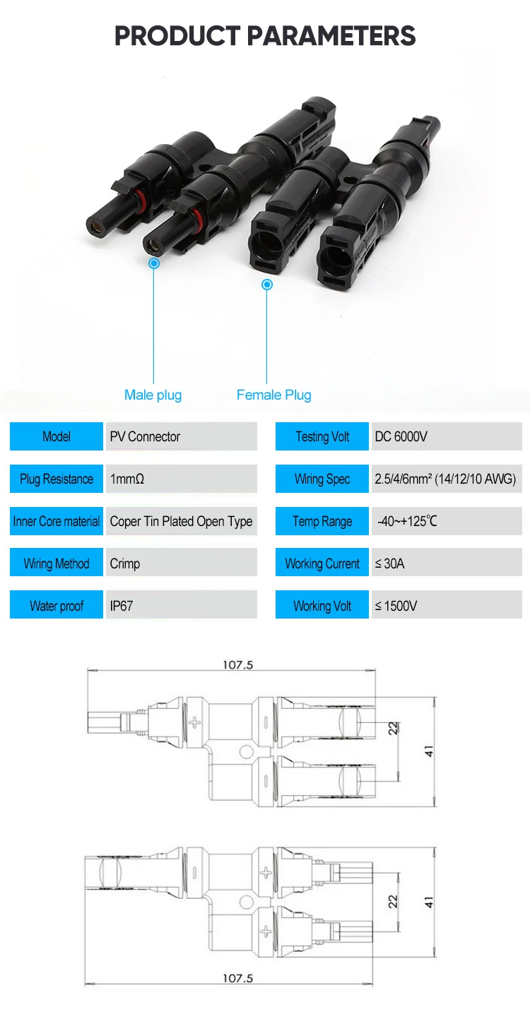 Câble standard: 2,5/4,0/6,0 mm² (14/12/10 AWG) , Certification TUV. 1 paire de connecteurs de panneau solaire à filetage M12 compatibles avec le montage sur panneau Connecteur fileté M12 compatible de haute qualité : Fiche étanche Panneau Photovoltaïque 1000V 1 Paire De Connecteurs De Type Y Câble Solaire PV Câble De Connecteur Photovoltaïque 1000V Cette paire de connecteurs MC4 permet de raccorder vos panneaux photovoltaïques à des câbles de 4mm² à 6mm² ou 10mm². Cette connectique est rapide à mettre en place, étanche et assure un raccordement sans perte d'énergie de vos panneaux solaires Connecteurs de panneaux solaires - ce connecteur de câble de panneau solaire est une paire de connecteurs anti-éclaboussures et ignifuges spécialement conçus pour une utilisation en extérieur avec l'énergie solaire, connecteur photovoltaïque pour panneau solaire Connectique panneau solaire - Raccord de câble AC monophasé