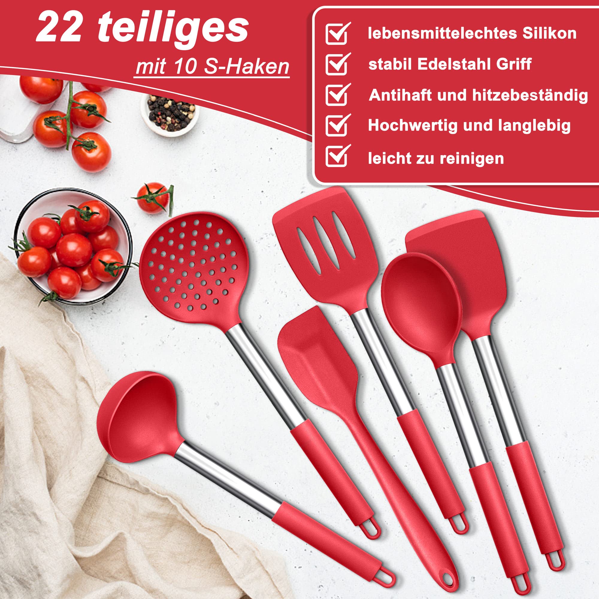 Excellent rapport qualité/prix. Ce set de 25 ustensiles de cuisine Herogo, c'est l'équipement complet pour cuisiner comme un chef ! En silicone de qualité alimentaire résistant jusqu'à 230°C, ces ustensiles sont sans danger pour tes poêles antiadhésives - fini les rayures Contenu du colis : 1 spatule ajourée., 1 spatule solide., 1 louche profonde., 1 pelle à pâtes., 1 spatule flexible., 1 cuillère spatule., 1 spatule à étaler., 1 spatule ajourée., 1 brosse à chauve-souris., 1 fouet., 1 cuillère à fente., 1 cuillère solide., 1 pince de cuisine., 1 support. Un ensemble d'ustensiles de cuisine répond à tous les besoins : ensemble d'ustensiles professionnels de 25 pièces comprenant une spatule fendue, une spatule solide, une louche profonde, une cuillère à pâtes, une spatule flexible, une spatule à cuillère, une spatule à épander, une spatule fendue, un fouet à œufs, une cuillère solide, un séparateur d'œufs, une pince de cuisine et un support, 5 cuillères à mesurer et 5 tasses à mesurer de tailles différentes Ustensiles cadeau idéal : cet ensemble de 25 ustensiles de cuisine en silicone a tout ce dont vous avez besoin pour la cuisine quotidienne, votre excellent assistant de cuisine pour cuisiner plus de délicieux aliments pour la famille, apporte plus de commodité pour la cuisine, également comme un excellent cadeau pour les amis et la famille à Noël ou une pendaison de crémaillère Ustensiles De Cuisine En Silicone Herogo Lot De 22 Avec Support, Spatule, Cuillère Pour Ustensiles De Cuisine Antiadhésifs, Résistants à La Chaleur Et Aux Rayures, Passent Au Lave-vaisselle (rouge Ustensiles Cuisine 1 séparateur d'œufs. Ustensiles de cuisine résistants à la chaleur : les ustensiles de cuisine en silicone de qualité supérieure sont résistants à la chaleur de 230 ℃ ce qui permet de mélanger ou de remuer directement dans les poêles. Fermement combinée avec de l'acier inoxydable, les poignées sont robustes et antirouille, solides et durables pour un usage quotidien 5 cuillères à mesurer (5 tailles différentes). TWBEST Ustensiles de Cuisine Silicone,44pcs Ensemble d'ustensiles de Cuisine en Silicone avec 20 5 tasses à mesurer (5 tailles différentes). Matériau. Silicone · Couleur. Bleu · Marque. Herogo · Poids de l'article. 1,21 Kilogrammes · Peut passer au lave-vaisselle. Oui · Forme. Rectangulaire