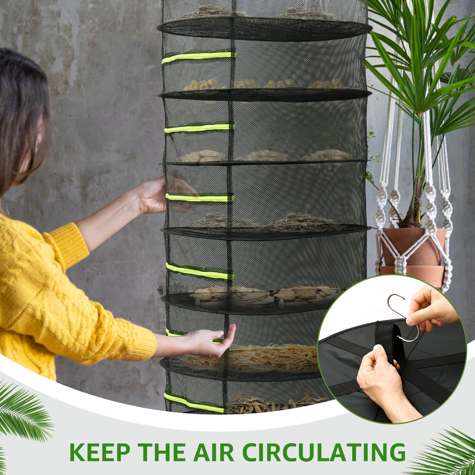 Fermeture éclair : chaque couche du filet de séchage est équipée d'une fermeture éclair verte qui adopte un design entièrement fermé. Support DIY pour faire sécher des herbes aromatiques à la maison Liste des pièces : 1 crochet., 1 sac de rangement. Le dessus de l'étendoir est étanche pour empêcher l'eau de pluie de pénétrer et éviter que les objets internes ne soient mouillés. Lorsqu'il n'est pas utilisé, le filet de séchage peut être plié et placé dans le sac de rangement pour le transporter et le ranger facilement. Utilisation polyvalente : ce séchoir à herbes peut être utilisé par les amateurs de jardin à domicile, les petites fermes, les entreprises de transformation des aliments et d'autres endroits. Ouvrez la fermeture éclair du sac de rangement, et le filet de séchage peut être déplié automatiquement (doit être ouvert pour éviter les accidents) et peut être accroché à la position appropriée avec des crochets. Séchoir à herbes en maille à 6 niveaux suspendu avec ouverture à... 1 filet de séchage à 8 étages. Filet de séchage suspendu pour herbes, filet pour plantes à 8 Filet De Sechage Jingzhan Séchoir à Herbes, Filet De Séchage Suspendu à Suspendre Pliable, Panier De Séchage Avec Fermetures à Glissière, 60 Cm X H 40cm, 2 Couches, Pour Herbe Viande Plante Légumes Fruits Nylon Aéré Crochets Inclus Utilisation suspendue : la conception suspendue permet une utilisation indépendante de chaque couche du filet de séchage, ce qui permet aux utilisateurs de sécher facilement les herbes, les plantes, les fleurs, le poisson, les noix et d'autres objets en même temps. Description : Avec 8 couches de filet de séchage, il peut utiliser l'espace vertical de manière optimale pour sécher une grande quantité d'herbes en même temps, ce qui augmente considérablement la capacité de séchage par rapport aux outils de séchage à couche unique. Caractéristiques : Lorsqu'il est suspendu, l'air autour de lui peut circuler plus uniformément, et entre chaque couche de filet de séchage, il y a un certain intervalle pour que les herbes puissent sécher plus rapidement et plus uniformément. Caractéristiques : Matériau : nylon., 8 couches : 60 × 170 cm. Couche unique : 20 cm de haut.