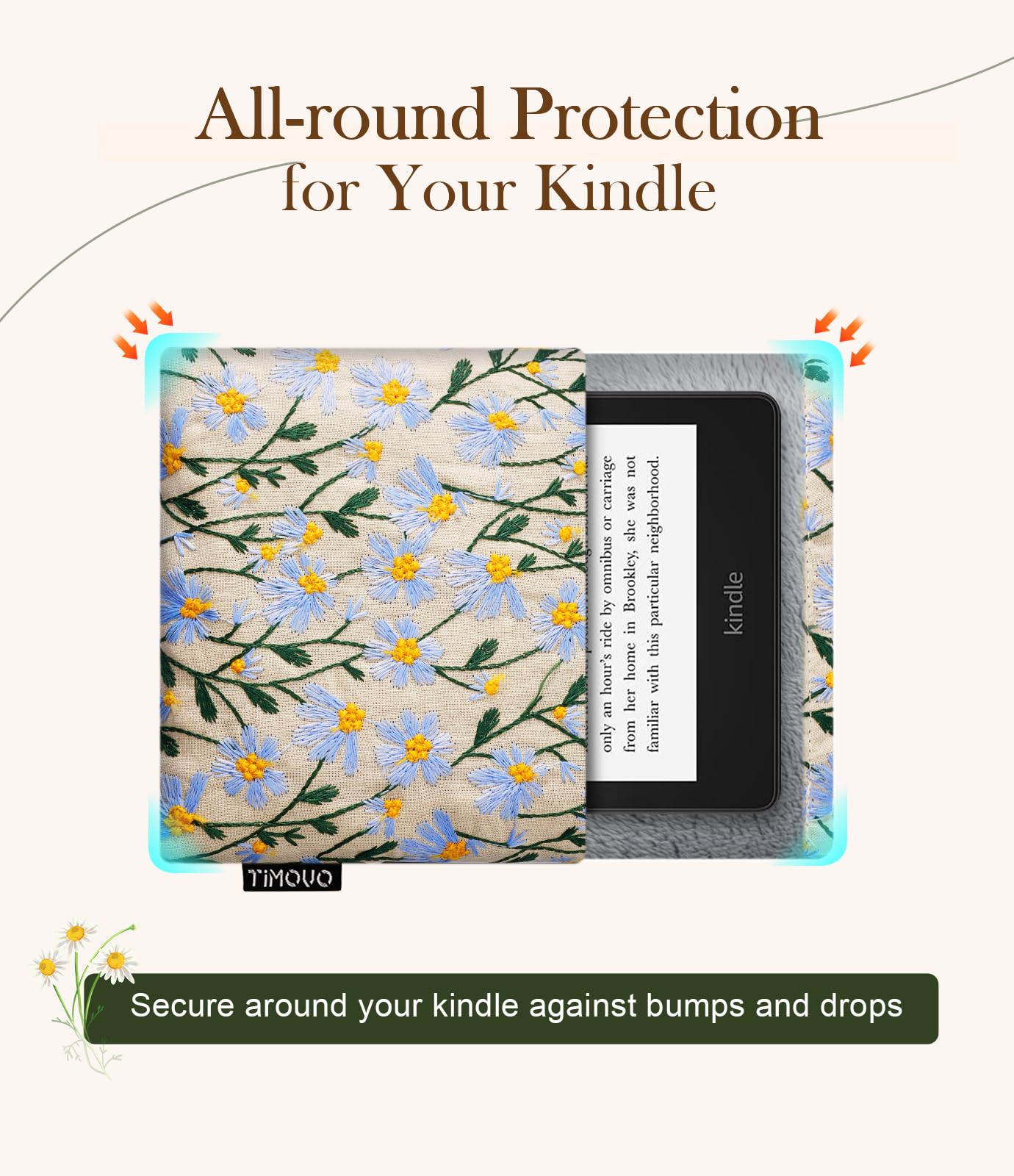 Elle s’adapte facilement à différentes situations, à la maison, au bureau ou dans les transports. MoKo Pochette rembourrée brodée motif marguerites 6-7 pour 1. Étui de protection pour lecteur électronique Kindle/Kindle Oasis/Kobo de 6 pouces, pochette rembourrée marguerite brodée pour Kindle Paperwhite de 7 pouces Pratique et fonctionnel : Conception de grande capacité, permet de ranger facilement le Kindle et ses accessoires ; ouverture et fermeture éclair, facile à sortir et à ranger, pratique pour un usage quotidien ou en voyage. Ajustement précis : Dimensions 21×15,5×2,0 cm, spécialement conçu pour le nouveau Kindle 7 pouces, le Kindle 4/5 et les liseuses électroniques, s’adapte parfaitement sans vaciller. Ne vous inquiétez pas de la chute de votre appareil. L'étui pour kindle dispose également d'une poche organisatrice supplémentaire, parfaite pour ranger des stylos, des écouteurs, des câbles et même quelques petits accessoires Adaptée à de multiples usages : elle peut servir de pochette de rangement pour Kindle ou pour ranger de petits appareils électroniques comme des tablettes. Design moderne : Le motif marguerite beige apporte une touche de fraîcheur et d’élégance à votre Kindle. étui élégant Et Pratique TiMOVO Sac Pour Kindle Paperwhite 7 Et Kindle Colorsoft Signature étui Liseuse Protection Antichoc Imperméable