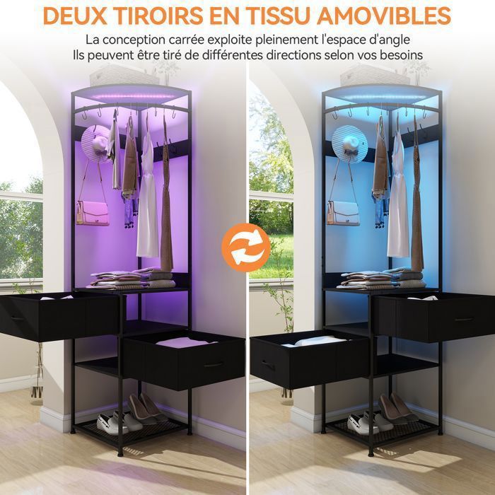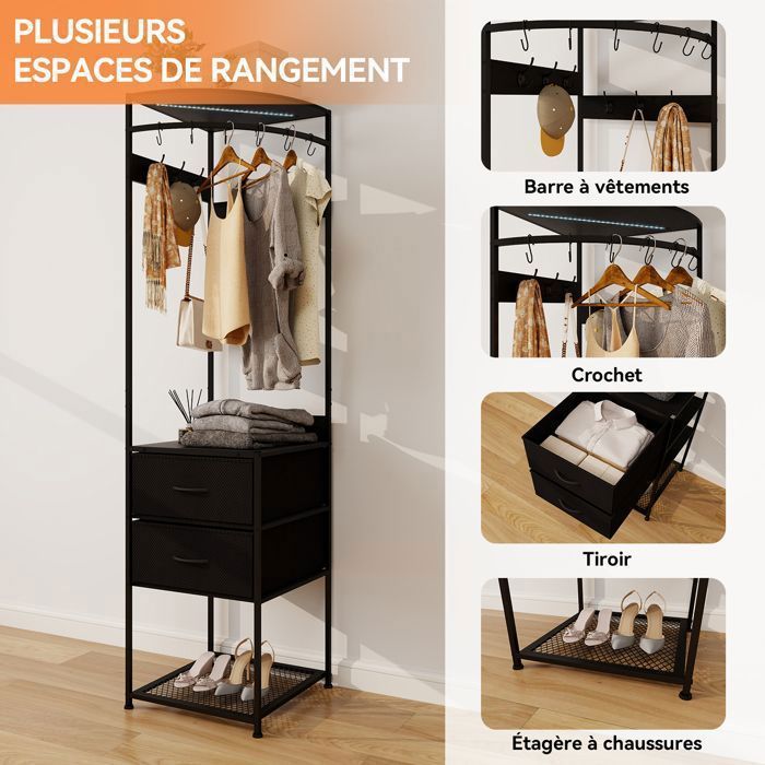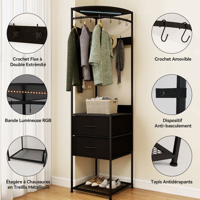 Contrôlée via une application, notre porte-manteau propose 58 couleurs de lumière et plusieurs modes de fluctuation. 6 doubles crochets latéraux 2 tiroirs toile XXL (pantalons/chaussettes) Rangez vos écharpes, chapeaux, sacs et même vos jupes longues et vos manteaux sans encombrer votre espace vital Porte manteau pour entrée | Porte manteau design Barre centrale avec 6 crochets S amovibles (sacs/chapeaux) 【RANGEMENT COMPLET ET PRATIQUE】 : Meuble d'entrée élégant avec un sommet pour les boîtes de rangement, une barre à vêtements avec 6 crochets mobiles en métal en S, et deux côtés avec 3 crochets doubles fixes. Structure métal + panneaux bois premium avec patins anti-glisse + ancrage anti-bascule. Leur conception astucieuse vous permet de les ouvrir de différentes directions Les chaussures sont visibles et accessibles en un coup d'œil, simplifiant votre routine quotidienne et apportant de l'ordre dans votre entrée. SOLDES Découvrez un large choix de meuble d'entrée, meuble à chaussures, meuble de rangement, porte-manteaux en promotion et avec des nouveautés toute l'année sur et dans tous les magasins La grille inférieure en métal avec une conception aérée permet de ranger vos chaussures tout en facilitant la ventilation. 【STABILITÉ ET SÉCURITÉ MAXIMALES】 : Conçue avec un cadre en fer solide et des planches en bois de haute qualité, cette portant à vêtements combine robustesse et élégance. Accrochez vos manteaux grâce à nos meubles de vestiaires ou Porte-manteaux muraux que nous proposons chez . Vos articles sont livrés à domicile Contrôlée via une simple application, elle permet de choisir parmi 58 couleurs et plusieurs modes de variation. Rangements Pratiques et Adaptatifs Grille aérée à chaussures. 【TIROIRS EN TISSU PRATIQUES】: Les deux grands tiroirs en tissu de 45,5 x 42 x 17,5 cm offrent suffisamment d'espace pour les chaussettes, pantalons, chemises ou vêtements épais. Porte-manteau Métal Bois Moderne Porte-Manteau, Meuble D'Entrée, Vestiaire, Portant, Avec Banc Et Étagères à Chaussures, Crochets, Blanc - Maison Rangement Chaussures Aéré Organisation Sur-Mesure 6-en-1 Top pour boîtes de rangement Les pieds antidérapants assurent une stabilité parfaite sur tous types de sols et protègent votre revêtement contre les rayures. Bandeau LED RGB 58 couleurs : créez une lumière romantique pour un dîner, une énergie dynamique en matinée – l’humeur change en un clic ! 【POLYVALENCE POUR TOUS LES INTÉRIEURS】 : Idéale pour l'entrée, la chambre, le dressing ou tout autre espace de votre maison, ce vestiaire d'entrée apporte une touche contemporaine et pratique.