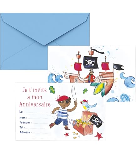 Thème Pirate Fête Enfants Lot 5 Cartes "Invitation" Pirates Avec 5 Enveloppes Blanches Enveloppe 14x14 Beaux-Arts et Loisirs créatifs - Découvrez notre offre Lot 5 Cartes "Invitation" Pirates Avec 5 Enveloppes Blanches 9x14cm - Texte Je t'invite pour ... le (date) à (heure Carte d'invitation anniversaire enfant Carte au Trésor Pirate personnalisée avec vos photos et textes. Echantillon et enveloppes offerts coloré ; multicolore ; postale ; graphique ; écrire ; message ; mots ; lettre ; souhaiter ; vœux ; cadeau ; fêter ; célébrer ; offrir ; poster ; boîte aux lettres ; surprise ;, Papier Cartonné AFIE C5272 Remerciements Condoléances Lot 5 Cartes identiques Colombe de la Paix Texte Argenté