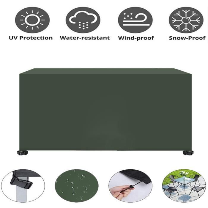 LSYALUCK Housse Salon de Jardin, Housse de Table Jardin Rectangulaire, Protection pour Tous Les Temps Housse de Table Extérieur Bâche Tissu 600D Oxford, pour Mobilier différentes Tailles 400x400x70cm Tous les problèmes peuvent être résolus avec des housses de meubles de patio extérieur. convient à la plupart des meubles, il existe de nombreuses tailles au choix(personnalisable). Facile à nettoyer, à arroser avec la smart et à sécher au soleil. Suffisamment grand pour couvrir tous les types de meubles de patio, tables, bancs, tables basses, chaises ou autres meubles rectangulaires. En tissu Oxford 600D ultra-résistant, elle protège vos meubles du soleil, de la pluie, du vent et même de la neige. Le tissu est noir/argent pour mieux... la couverture de table est plus imperméable et résistante aux UV. Si vous n'avez pas besoin d'utiliser cette housse de protection pour salon de jardin, vous pouvez la plier et la mettre dans le sac de rangement. qui est efficacement imperméable et protège des UV Protégez efficacement tous les types de meubles, Recommandez de mettre quelque chose au milieu de la table pour éviter l'accumulation d'eau au milieu. Veuillez choisir une housse plus grande que le meuble pour vous assurer que votre meuble est entièrement couvert et protégé housse salon de jardin Convient à la plupart des tables et des chaises. taille: (LxWxH) Une variété de tailles au choix! Forte performance imperméable à l'eau, a une longue durée de vie. La surface du tissu est recouverte d'un revêtement non hydrophile qui permet à la pluie/l'eau de s'écouler comme une goutte. 【RAPPEL CHALEUREUX】réduire l'accumulation d'eau de pluie sur le couvercle de protection peut prolonger efficacement la durée de vie du couvercle de protection. Convient à toutes les saisons, cette bache de protection salon de jardin peut protéger vos meubles toute l'année 【MATÉRIAU AMÉLIORÉ OXFORD VERSION 】Housse salon de jardin de fabriqué en tissu Oxford 600D robuste aux intempéries, La housse de meuble est constituée de matériaux hydrophobes à double couture et la couche intérieure est dotée d'un revêtement imperméable, capable de résister aux intempéries, à l'eau et aux déchirures. Portable, facile d'entretien. couverture de patio rectangulaire Équipé de 4 boucles durables et d'un cordon de serrage réglable, s'adapte mieux au meuble et évite d'être emporté. Housse Salon Jardin LSYALUCK 370x200x70cm/LxWxH Housses De Meubles De Jardin Bâche Table Jardin Imperméable Anti-UV 【BÂCHE TABLE JARDIN RÉSISTANT AU VENT】Les quatre coins de housse de meuble est avec 4 boucle Verrouillage en nylon, pouvez fixer le housse de protection aux pieds de la table. housse table de jardin, Les bords cousus à haute densité garantissent que le revêtement du meuble de la terrasse ne se fissure pas facilement, même par mauvais temps. MATÉRIAU AMÉLIORÉ OXFORD VERSION ]Housse salon de jardin de fabriqué en tissu Oxford 420D robuste aux intempéries, La housse de meuble est constituée de matériaux hydrophobes à double couture et la couche intérieure est dotée d'un revêtement imperméable, capable de résister aux intempéries, à l'eau et aux déchirures Et il y a une boutons réglables de corde et une Fastening Tape sur la housse de table, donc risque pas de s'envoler.