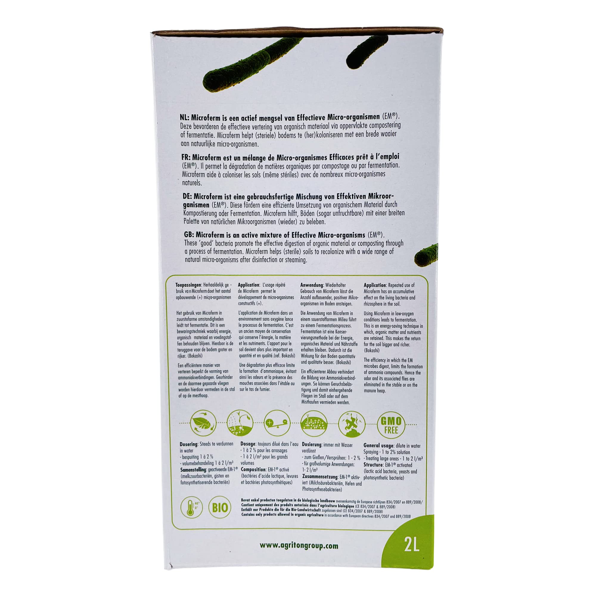 Moutta | EM Microferm 20L BIB | Mélange Micro-organismes efficaces actif prêt à l'emploi 100% naturel MOUTTA 115,90 € PLUS DE DÉTAILS ✅ Il permet la dégradation de matières organiques par compostage ou par fermentation. Microferm EM Micro-organismes Efficaces ® 2L - - 100% Naturel - Jardin Agriculture Améliorant Sol Biologique 2L Décomposition Matière Organique Utilisé en pulvérisation ou en arrosage, il favorise la fertilité naturelle, renforce la santé des plantes et optimise le compostage tout en réduisant odeurs et nuisances. Ainsi, il limite la présence de mouches et d'odeurs désagréables dans l'environnement. ✅ Il va assurer une bonne décomposition de la matière organique et une croissance équilibrée des plantes pour une quantité de vase contrôlée au fond des étangs. Vente d'EM® les micro-organismes efficaces Conçus et mis au point par le Professeur Teruo Higa au Japon, ces Micro-organismes Efficaces favorisent et stimulent le développement des micro-organismes bénéfiques présents dans le sol et garantissent ainsi l’activité biologique et la fertilité du sol Nos 5 meilleurs Microferm - Noël 2025 Il améliore l’appétence et la digestion, soutient les performances d’élevage (avicole, bovin, porcin, équin, etc. ✅ Le microferm à un grand nombre de micro-organismes bénéfiques (appelés EM) de coloniser le sol et les plantes. Nutribiome – Préparation microbienne pour l’élevage Nutribiome est une solution fermentée à base de mélasse de canne et de micro-organismes efficaces (EM), spécialement conçue pour l’alimentation animale.