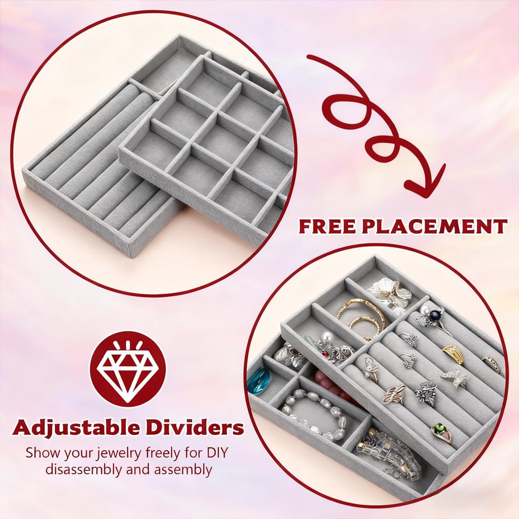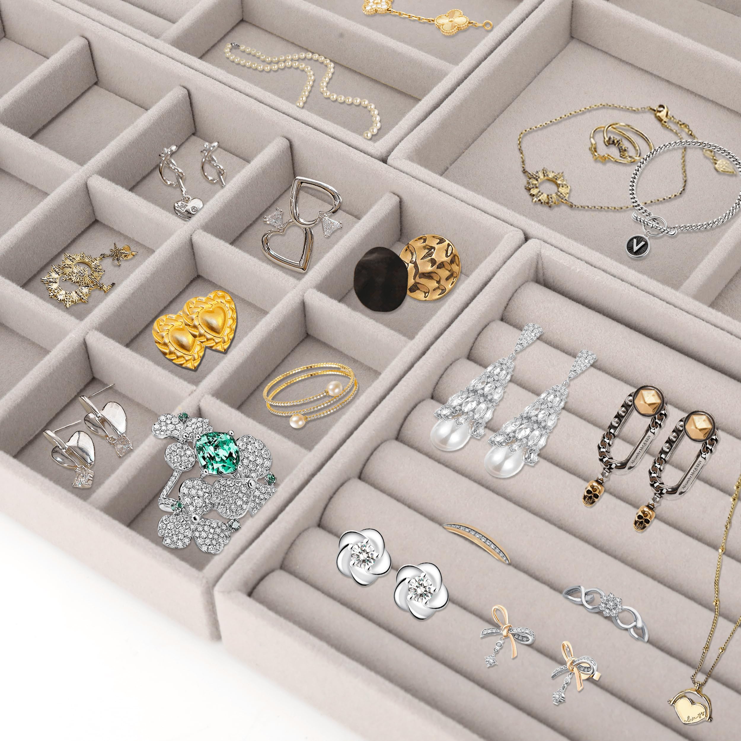 Quels sont les avantages de notre organiseur à bijoux pour tiroir ? 1., Matériaux de haute qualité : Fabriqué en MDF floqué et robuste, ce coffret à bijoux offre un toucher doux et délicat tout en étant durable., 2., Rangement organisé des bijoux : L'ensemble contient 4 organiseurs à bijoux, mesurant chacun 21 x 12,5 x 2,3 cm (8,3 x 4,9 x 0,9 pouces). Protection douce pour vos bijoux : Ces plateaux à colliers sont doublés de velours doux et dotés d'un rembourrage en mousse pour éviter les rayures et les dommages, préservant ainsi l'intégrité de vos bagues, boucles d'oreilles et bracelets Conçu avec plusieurs compartiments, il permet de ranger efficacement différents bijoux, les rendant facilement accessibles et bien organisés., 3., Design réglable et empilable : Ces plateaux à bijoux sont dotés de séparateurs amovibles, permettant une personnalisation flexible des compartiments selon vos besoins de rangement. Les plateaux empilables s'intègrent parfaitement dans les tiroirs, les commodes ou les étagères. Des fentes sécurisées pour bagues maintiennent vos bijoux en place. Separateur Tiroirs 4 Pcs Plateau Bijouxes, Rangement Bijoux Tiroir Organiseur, Plateaux U00e0 Bijoux Empilables En Velours Pour Tiroir, Coiffeuse, Boucles D'oreilles, Bagues, Bracelets, Colliers, Cadeaux Pour Femmes Organisateur De Tiroir L'empilage optimise l'espace, garantissant que votre coiffeuse ou votre coiffeuse reste propre et organisée., 4., Doublure douce pour une protection optimale : Ces plateaux à bijoux sont doublés de flocage et dotés d'un rembourrage en mousse à la surface douce pour protéger vos accessoires des rayures et des dommages. Personnalisables et peu encombrants : Ces plateaux de rangement à bijoux sont dotés de séparateurs amovibles, vous permettant d'adapter leur disposition à vos besoins. Leur empilabilité optimise l'espace et vous permet de ranger facilement votre commode ou votre coiffeuse. La rainure sécurisée pour l'anneau empêche les objets de bouger ou de tomber., 5., Polyvalents : Ces plateaux sont conçus pour être flexibles et peuvent accueillir bagues, boucles d'oreilles, colliers, bracelets, broches, montres et accessoires pour cheveux. Lot De 6 Supports Ronds En Bois Pour Pot De Fleurs - Pour Intérieur Et Matériaux haut de gamme : Fabriqués en flocage doux et en MDF robuste, ces organiseurs à bijoux sont doux au toucher et durables. Ce plateau en velours sert au rangement de toutes sortes de bijoux. Il a 4 compartiments : 1 long avec des rouleaux pour ranger les bagues ou mêmes des boucles d'oreilles ; 1 long pour les colliers ; 2 rectangulaires pour les chaînes, médailles et autres petits bijoux