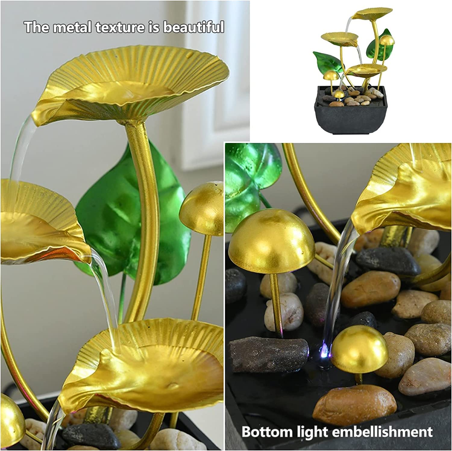 Fontaine mudra et lotus – venez ce que vous êtes 215 x 130 x 130 mm / 8,46 x 5,12 x 5,12 pouces Application : Convient pour le salon, la chambre à coucher, le bureau, la décoration de table basse, la décoration de meuble TV Poids : env. Fontaine De Table Moderne Fontaine D'eau D'intérieur, Fontaine De Relaxation En Feuille De Lotus Dorée à 3 Niveaux Avec Lumière, Fontaine D'eau De Table Intérieure, Fontaine D'eau De Relaxation Fontaine De Table Description du produit Fontaine d'eau d'intérieur, Fontaine de Relaxation en Feuille de Lotus dorée à 3 Niveaux avec lumière, Fontaine d'eau de Table intérieure, Fontaine d'eau de Relaxation Liste des paquets : 1 x fontaine à eau 1 x base 1 Éclairage chaleureux : la fontaine à eau de bureau d'intérieur est dotée de lumières LED pour une lumière ambiante douce la nuit, économe en énergie, fiable et esthétique. L'eau cascade sur 3 niveaux créant un bruit apaisant, parfait pour relaxation ou méditation. Éclairage LED intégré pour ambiance douce le soir. Alimentation USB... Fontaine en résine avec bouddha Jati Circulation d'eau courante et réglable : les caractéristiques d'une circulation d'eau constante pour vous apporter une richesse incessante, et les paramètres de débit réglables vous permettent de contrôler le débit d'eau et d'éviter les déversements sur la table., 1., Matériau de qualité supérieure : fabriquée à partir de fer et de matières plastiques de qualité supérieure, la fontaine cascade de table est robuste, fiable et pour un fonctionnement prolongé., 2., Fonctionnement silencieux : équipée d'une pompe à eau silencieuse, la fontaine à eau de table assure un fonctionnement silencieux dans un environnement paisible sans bruit perturbateur., 3., Circulation d'eau courante et réglable : les caractéristiques d'une circulation d'eau constante pour vous apporter une richesse incessante, et les paramètres de débit réglables vous permettent de contrôler le débit d'eau et d'éviter tout déversement sur la table., 4., Éclairage chaleureux : la fontaine à eau de bureau d'intérieur est dotée de lumières LED pour une lumière ambiante douce la nuit, économe en énergie, fiable et esthétique., 5., Taille compacte : la conception petite et légère de cette fontaine cascade de relaxation de bureau permet une portabilité facile, un placement pratique et une occupation d'espace minimale., 6., Facile à utiliser et à installer : avec une installation et un fonctionnement simples, la fontaine à eau en feuille de lotus est facile à installer sans avoir besoin de canalisations supplémentaires, il suffit de l'assembler en suivant les étapes fournies. 850,00 g / 29,98 oz Comment utiliser : 1., Plongez la pompe à eau dans l'eau., 2., Branchez l'alimentation pour l'allumer. Fonctionnement silencieux : équipée d'une pompe à eau silencieuse, la fontaine à eau de table assure un fonctionnement silencieux dans un environnement paisible sans bruit perturbateur.