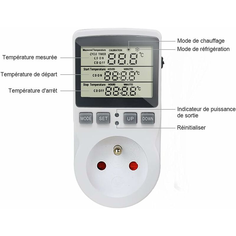 Prise hygrostat numérique pour une régulation climatique polyvalente Prise thermostat numérique avec mode chauffage/climatisation automatique Une simple pression sur un bouton permet de réinitialiser l'appareil, d'étalonner les températures ou de basculer entre °C et °F. Modes de chauffage et de climatisation automatiques pour un contrôle fiable des appareils connectés dans la plage souhaitée. Tension d'entrée : 100-250 V CA, 50/60 Hz Nouvelle Prise de minuterie numérique EU plug 230V-50Hz intelligent LCD... Jooheli Prise thermostat numérique 230 V 16 A avec sonde Contrôle intelligent du temps : Grâce à la prise minuterie intégrée à 4 modes, la fréquence de commutation est réglable en toute flexibilité. Thermostat intégré avec capteur, elle s'utilise de manière polyvalente et efficace dans tous les environnements. Fonctions de sécurité avec alarme : En cas de défaut du capteur ou d'écart de température, le thermostat se déclenche et déclenche une alarme. Unité d'affichage : °C/°F commutable Prise Thermostat Numérique, Prise Minuterie 230V 16A, Prise Régulateur De Température Avec LCD, Prises Thermostats Avec Capteur, Thermostat Terrarium, Pour Protection Antigel De Serre Chauffage Prise Hygrostat Prise thermostat multifonction : prise thermostat numérique, pas de câble nécessaire, il suffit de brancher l'appareil à cette prise thermostat de régulateur de température et de régler les paramètres, il fonctionne comme programmé Compte à rebours : 0-99 h 59 min Fonction mémoire pour enregistrer les données en cas de panne de courant Longueur du capteur : environ 1,7 m Prise Thermostat Numérique, Prise Minuterie 230V 16A, Prise Régulateur De Température avec LCD, Prise Thermostat avec Capteur, Thermostat Terrarium, pour Protection Antigel de Serre Chauffage Prise thermostat numérique avec écran LCD pour un affichage clair de toutes les valeurs Caractéristiques du produit : Nom du produit : Prise thermostat numérique La prise de régulation de température numérique protège vos appareils grâce à des fonctions d'avertissement fiables et des performances stables.