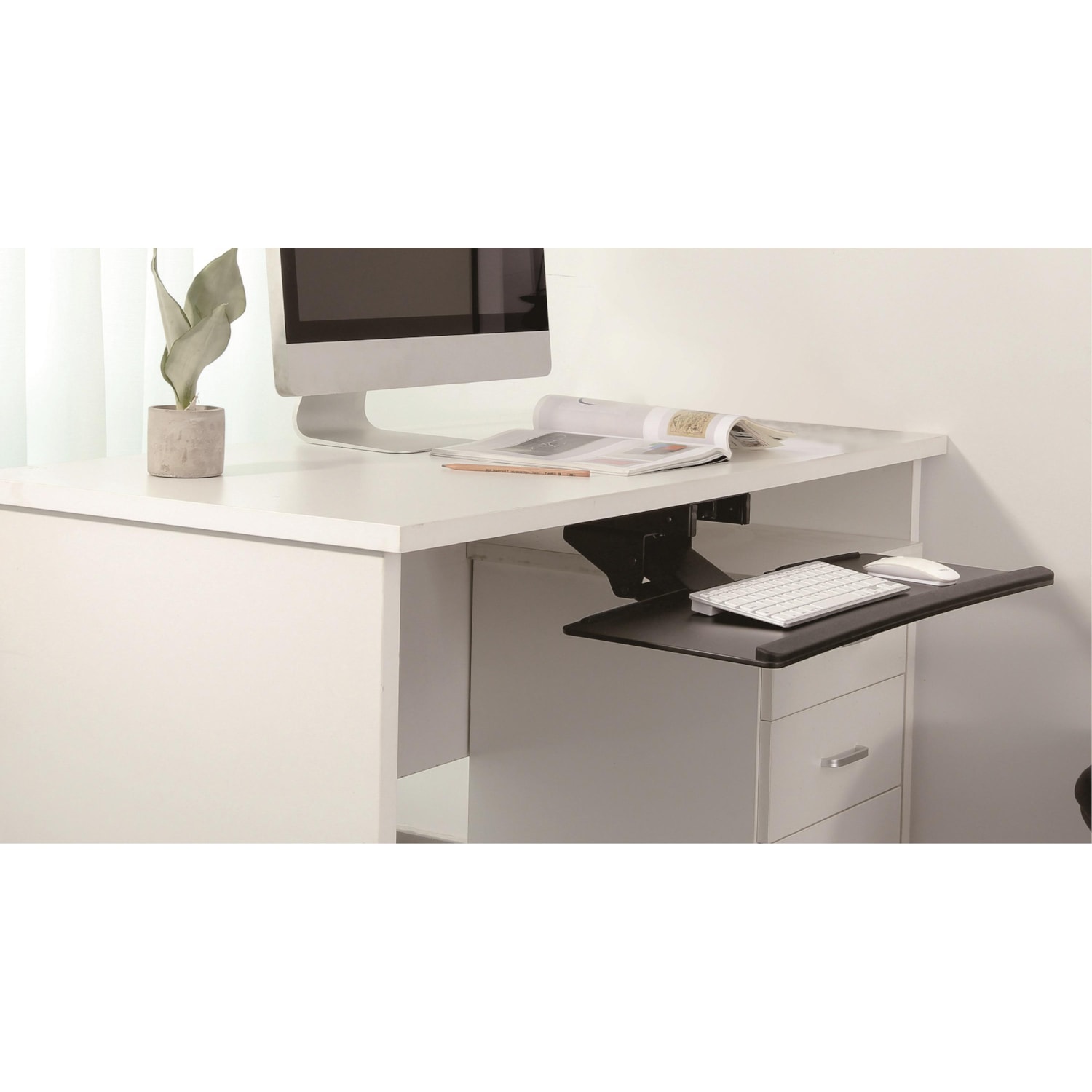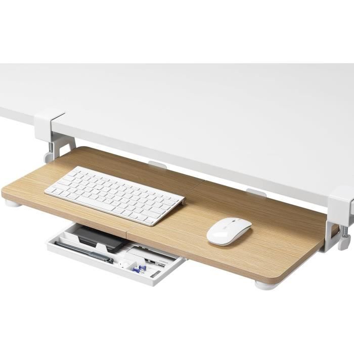 Il peut être facilement monté sur des bureaux jusqu'à 5 cm d'épaisseur. L'étagère à pincer : conception à pince en C, vous n'avez pas à vous soucier d'endommager votre bureau. Avantage ergonomique : les tablettes pour clavier avec pince de bureau sont conçues pour élever le clavier et la souris à une hauteur plus ergonomique et réduire ainsi la charge sur l'épaule et le poignet. Design thermique : le moule thermique aide à protéger la surface du plateau contre les rayures, une solution d'emballage idéale qui peut aider à préserver l'intégrité de votre tablette clavier. Les plastiques thermoformés sont des polymères naturels dérivés de matières organiques telles que la canne à sucre ou le maïs, qui sont souvent biodégradables. Gain de place : le plateau de clavier ETHU à clipser sous le bureau mesure 50 cm de long et 30 cm de large et peut contenir un clavier et une souris pleine taille. Sous le clavier se trouve un tiroir avec un espace supplémentaire pour votre téléphone et d'autres objets. Il se monte facilement sur des bureaux d'une épaisseur... ERGOMAKER Support de clavier sous bureau réglable (65×30 cm, 76 cm avec pinces) - Plateau ergonomique avec fixation en C - Blanc Plateau coulissant en acier amélioré : le design robuste et lisse en acier permet au tiroir de bureau de glisser doucement vers l'avant et vers l'arrière. L'amortisseur intégré le maintient fermement en place et l'empêche de glisser automatiquement. Les muscles du cou, évitent les pressions potentielles sur les poignets, favorisent une posture correcte et permettent une distance de vision adéquate. Il est compact, léger, résistant aux rayures et peut supporter la plupart des claviers et souris pesant jusqu'à 10 kg. Support Clavier Ergonomique Plateau De Clavier Sous Le Bureau Matériel Tout En Métal 53 Cm- 60 Cm Clavier Petit ETHU Petit plateau de clavier coulissant sous le bureau, tiroir coulissant avec pince en C, support de clavier d'ordinateur, plateau d'extension de bureau ergonomique pour bureau à domicile, 50 x 30 cm (noyer Il vous encourage à garder vos bras et vos poignets dans une position neutre et aide à prévenir les blessures causées par une mauvaise posture. Un grand tiroir de bureau crée un espace de travail supplémentaire précieux dans votre bureau. Les muscles du cou, évitent une éventuelle pression sur les poignets, favorisent une posture correcte et permettent une distance de vision appropriée. Gain de place : le plateau de clavier à clipser ETHU sous le bureau mesure 50 cm de longueur et 30 cm de largeur et offre de la place pour un clavier et une souris de taille normale. Il est compact, léger, résistant aux rayures et peut contenir la plupart des claviers et souris pesant jusqu'à 10 kg. Remarque : assurez-vous que le plateau du clavier est complètement déployé.