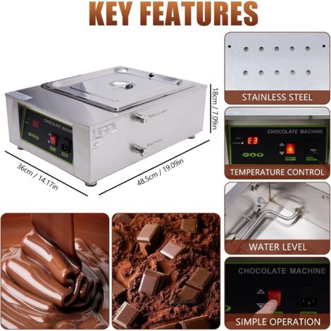 L'intérieur est chauffé par 5 plaques chauffantes en même temps, de sorte que le chocolat fond uniformément et évite les brûlures. Capacité maximale de fonte du chocolat en une seule fois : 12 kg., Capacité : 10 litres. Poids brut : environ 8 kg. ✔【Air chauffant, Anti-coking】 - Facile à utiliser. Fondoirs & tempéreuses à chocolat - FestiMarketFrance Tension : 230V/50Hz ; 110V/60Hz., Puissance : 500 watts. (CE et RoHS approuvé). Il peut également être utilisé pour chauffer, faire fondre de la crème, du lait, des bougies et du savon. La grande capacité améliore l'efficacité des chocolateries. Bon nettoyage, sain et sûr. La tempéreuse à chocolat est pratique à utiliser. Elle permet de faire fondre le chocolat et de le maintenir à une température stable ✔【Rustproof, Corrosion Resistant, Good Cleaning】 - Fabriqué en acier inoxydable de qualité alimentaire, haute densité et résistant à la corrosion. L'artisanat exquis et la taille compacte rendent le fondoir à chocolat numérique facile à utiliser. Contrôle numérique de la température] - Réglable entre 0-85°C/0-185°F. Fournit des températures précises et sûres pour les fours à fondre le chocolat La commande numérique rend la température plus précise et plus sûre. 1 x Manuel en anglais. Liste d'emballage : 1 x Unité principale. ✔【Chocolate Melter 】10L/22LBS - Facile à utiliser. Machine Chocolat Fondoir À Chocolat, Tempéreuse À Chocolat Commerciale 800 W, Tempéreuse Fondoir Crème Lait Bougie Savon L'acier inoxydable, la qualité de fabrication et la taille compacte rendent le fondoir à chocolat numérique très facile à utiliser. ✔【Hot Chocolate Melter】 peut être utilisé dans les chocolateries artisanales, les maisons privées, les hôtels, les restaurants, les boulangeries, les cafés, les fontaines de chocolat et ainsi de suite. Le fondoir à chocolat peut être utilisé dans une chocolaterie de bricolage, à la maison, dans un hôtel, dans un restaurant, dans une boulangerie, dans un café, dans un magasin de chocolat, dans une fontaine de chocolat, etc. Il peut également être utilisé pour chauffer, la crème, le lait et aussi pour toutes sortes de confitures, de bougies et de savons fondants.