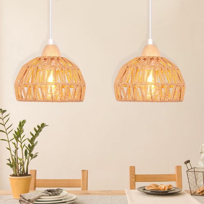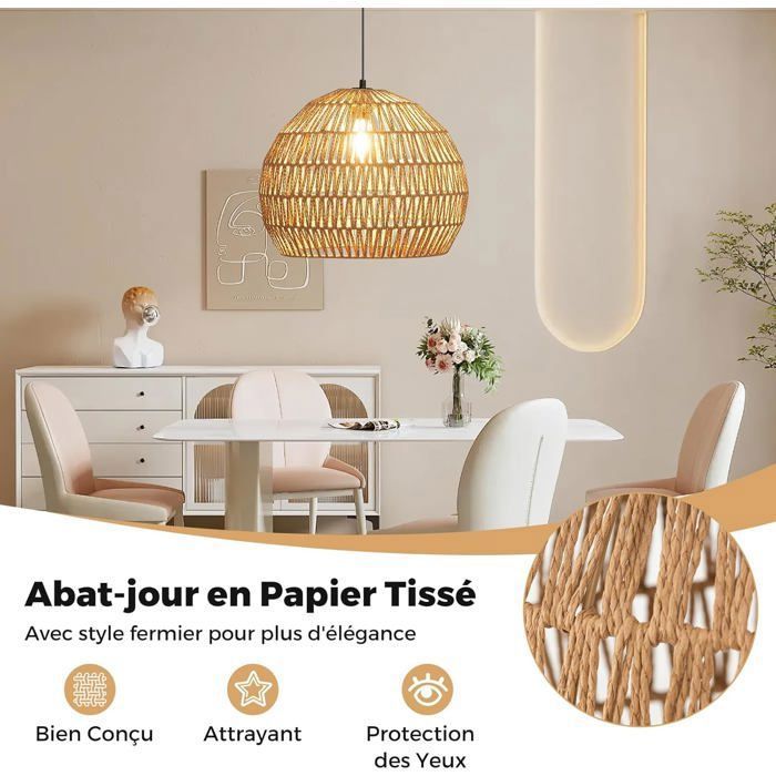 L'abat-jour en rotin tressé à la main ajoute un charme naturel à n'importe quelle pièce et est idéal pour les salons, les salles à manger ou les cafés Un superbe plafonnier double en rotin naturel tressé à la main Caractéristiques : L'abat-jour bohème en rotin petit (8 x 15 x 13 cm) est composé d'un abat-jour en rotin écologique et apporte une élégance organique à vos pièces. Lot de 3 pour décoration multiple : ensemble pratique de 3 petits abat-jours en rotin bohème, idéal pour harmoniser plusieurs luminaires dans la pièce. En tant qu'abat-jour boho-highlight, il apporte une touche élégante à n'importe quelle pièce Montage facile et utilisation flexible : l'abat-jour en rotin Boho Petit se fixe sur les douilles E27 en quelques secondes – sans outils ! L'abat-jour au look bohème crée une atmosphère chaleureuse et accueillante avec des effets d'ombre fascinants Cette belle suspension en rotin tressée à la main apporte une touche bohème confortable à n'importe quel intérieur. Soigneusement fabriquée par des artisans à l'aide de fibres naturelles durables, elle diffuse une douce lueur dorée, parfaite pour créer une ambiance accueillante et paisible dans votre maison L'abat-jour de style bohème souligne les textures naturelles et s'adapte au design scandinave et industriel. Abat-Jour De Style Bohème En Rotin | Abat-Jour Boho Tissé En Corde De Papier | Couvertures Rétro Abat-jour Naturel Salon Salle à Manger Café Lot De 3 Abats Jours IKAL En Rotin Tissé Main En Forme De Chapeaux Abat-jour Petit E27 La structure tissée dense protège contre les dommages, tandis que l'abat-jour de style bohème reste élégant et intemporel, parfait pour les intérieurs vintage et modernes Grâce à la structure tissée ouverte de l'abat-jour en rotin, l'abat-jour en rotin bohème diffuse uniformément la petite lumière et crée une atmosphère chaleureuse. L'abat-jour en rotin est facile à combiner, que ce soit comme lampe suspendue ou lampe de table. L'abat-jour au caractère bohème reste élégant. Caractéristiques : Matériau : corde en papier + fer Diamètre intérieur : 4 cm.