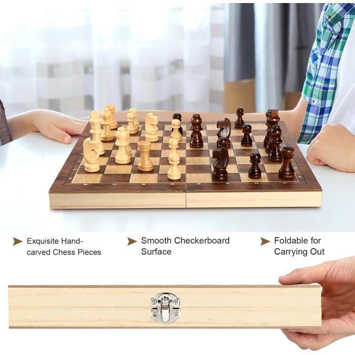 Description de Jeu d'échecs et de backgammon pliable 3 en 1 en bois 34 x 34 cm Il ne pourrait pas être plus pratique à transporter, l'échiquier pliable, facile à transporter, apporte beaucoup de plaisir à vous et à votre famille ou vos amis lorsque vous voyagez, campez, surtout lorsque 【Unique Cadeau】 : L'apparence exquise et les divers designs de Pliable Echec Chess Board Set en font un cadeau très unique pour la famille, les enfants, les amis ou les partenaires en tant que cadeau d'anniversaire, cadeau de Nouvel An, cadeau de Noël ou tout autre cadeau de vacances., Attention : 1., Le lavage à l'eau est interdit. Jeu 3 En 1 échecs Dames Jeu D'éChecs,3 En 1 Echiquier Magnetique,éChiquier En Bois Jeu Stratégie échecs Dames Cinq En Ligne Ils sont également parfaits pour passer le temps pendant les voyages. Utilisez un chiffon ou un mouchoir propre pour essuyer délicatement la surface du bloc., 3., Ne pas exposer à l'humidité. Ne pas placer le bloc dans un endroit humide, car le bois est sensible à l'humidité et aux moisissures., 4., Ne pas exposer au soleil. 19,99 €. Meilleur prix total. 19,99 € livraison incl. Prélèvement... Divertissement éducatif occasionnel : les échecs, sont depuis toujours un symbole durable... Jeu d'échecs magnétique 3 en 1 en bois avec échiquier pliable Les pièces d'échecs Jeu d'échecs Pliable sont conçues avec un flocage au fond, qui ne blesse pas l'échiquier et a un effet silencieux, les pièces se sentent délicates et ne rayent pas les mains, le stockage du fermoir matériel est facile à fermer, il n'est pas facile d'ouvrir simplement et de perdre les pièces. L'eau gonfle et déforme la finition, ce qui la fait sécher et se fissurer., 2., Essuyez doucement avec un chiffon. 【Échiquier Pliable et Puzzle】 : Jeu D'éChecs en Bois conception pliable, la boîte peut être stockée à l'intérieur des pièces d'échecs, vous pouvez le transporter, il ne prend pas beaucoup de place.