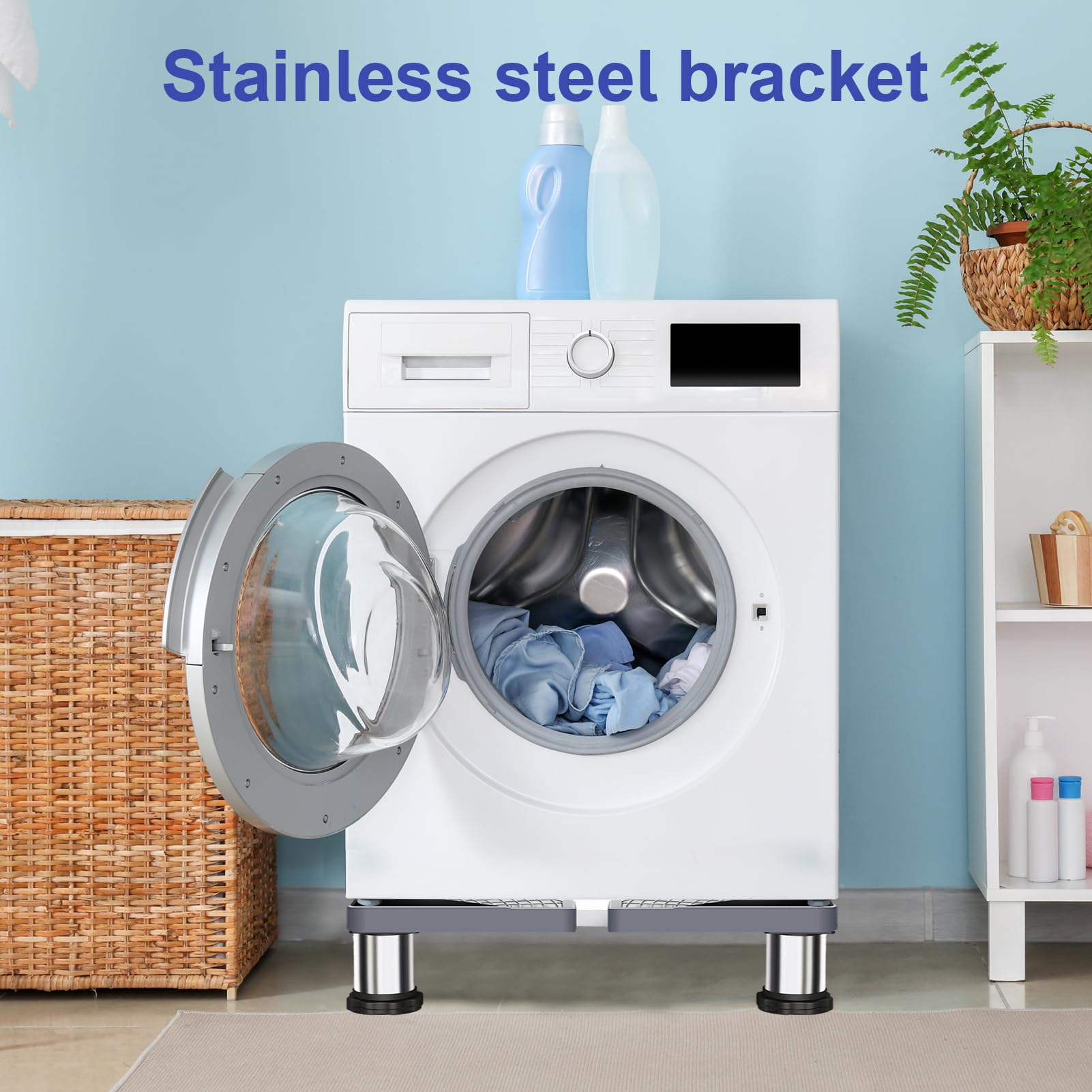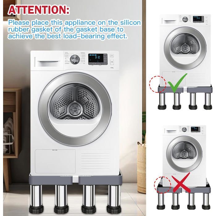 Réduction du bruit et protection contre les vibrations : le support de réfrigérateur est équipé de patins en caoutchouc anti-vibration noirs. Matériau : support de rondelle en acier inoxydable de haute qualité, panneau en polypropylène épais, pieds en acier inoxydable 4/8/12, force de charge forte Tous les matériaux sont imperméables et résistants à la corrosion, de sorte que vous n'avez pas à vous soucier de la rouille, même si vous l'utilisez près de l'eau. Peut soulever les machines à laver et les réfrigérateurs du sol, éviter efficacement le contact direct avec le sol. Il maintient la machine à laver ou le réfrigérateur à une certaine distance du sol et protège ainsi la machine à laver et le réfrigérateur de la corrosion et de la rouille. Large application : le support pour machine à laver est adapté pour les appareils ménagers au sol tels que les sèche-linge, les machines à laver, les congélateurs, les réfrigérateurs, les armoires, etc., Socle de base. (Pour vous assurer que votre machine à laver est 100 %, veuillez mesurer au préalable)., Conseils : 1., Ne placez pas plusieurs appareils sur ce produit, car cela pourrait provoquer l'effondrement et endommager votre appareil., 2., Ajustez la tige de connexion à la taille de vos besoins. Support de Machine à Laver Réfrigérateur Sèche-Linge Base de Machine à Installation facile : serrez les quatre pieds du cadre de base avec des vis, puis réglez la hauteur en tournant, ouvrez la boucle pour régler la longueur/largeur (utilisez un ruban à mesurer) et n'oubliez pas de le fermer après le réglage. Dimensions (réglable) : largeur de 40 cm à 60 cm, hauteur de 18 cm à 21 cm. Peut être rallongé en fonction de la machine à laver, du sèche-linge, du réfrigérateur et de la climatisation. En acier inoxydable, il résiste parfaitement à l'humidité et à la corrosion. Les dimensions sont réglables : 40-60 cm en longueur/largeur et 23-26 cm en hauteur... Support Réglable 40 60 Cm Antidérapant Socle Lave Linge, Base De Machine à Laver Réglable Acier Inoxydable Réduction Bruit Vibration 200kg Capacité de charge du support de machine à laver : 200 kg.