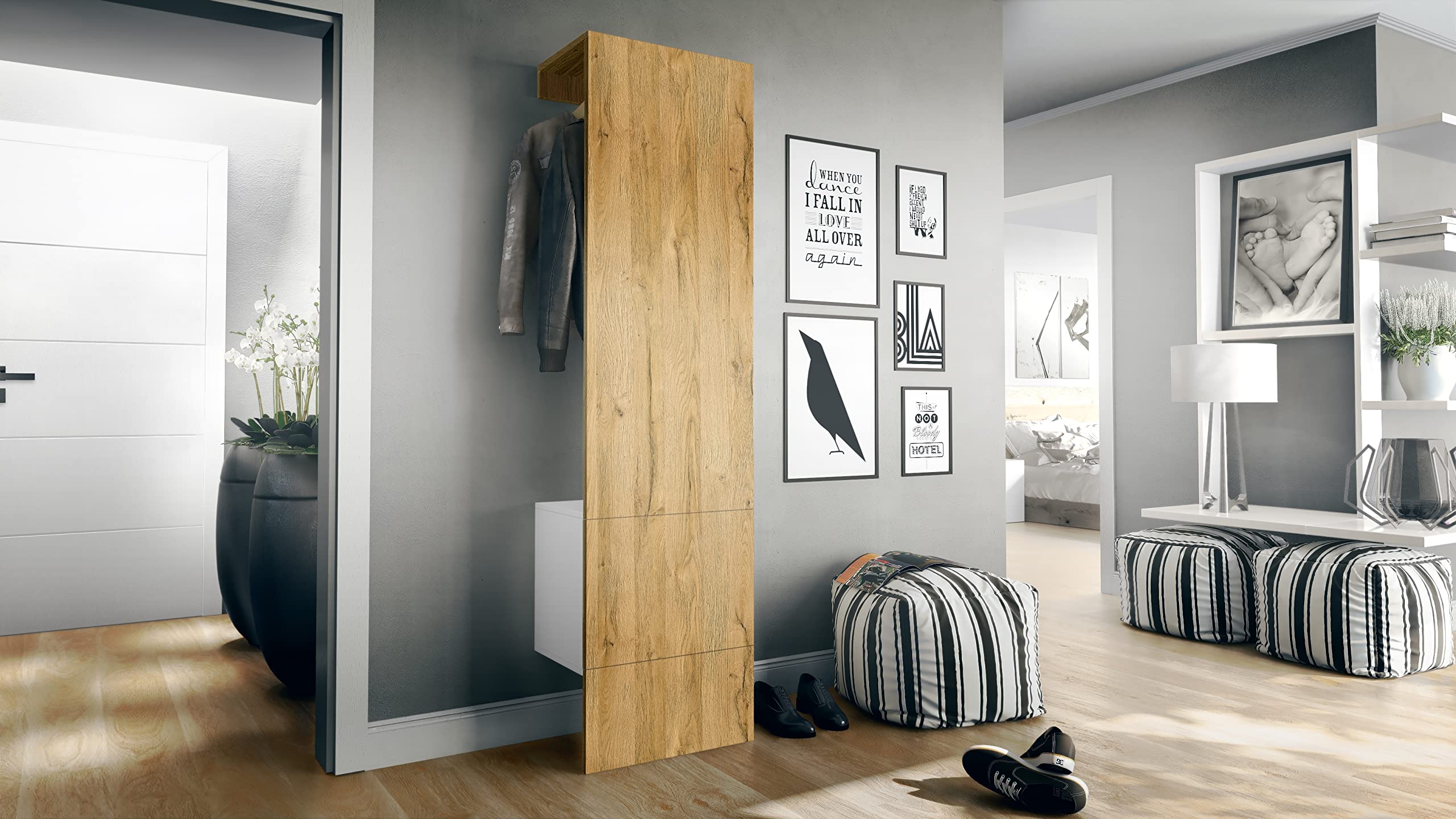 Plongez dans le monde de l'organisation moderne avec le portemanteau Carlton Set 4., Ce meuble élégant allie un design intemporel et une fonctionnalité de premier ordre. Le portemanteau Carlton Set 4 convient-il également aux petits couloirs ? Oui, le portemanteau Carlton Set 4 est conçu pour économiser de la place et s'adapte également aux petites entrées. Quelle est la capacité de charge du portemanteau ? Le panneau monté au mur peut supporter jusqu'à 10 kg, l'étagère pour le panneau et l'élément rabattable 15 kg et l'élément rabattable lui-même 30 kg. Un équilibre parfait entre esthétique et facilité d'utilisation. HOMCOM Ensemble de Meuble d'entrée avec Banc à Chaussures, Meuble à Pour le nettoyage, vous pouvez renoncer aux produits chimiques - un chiffon légèrement humide suffit amplement pour entretenir votre garde-robe. Découvrez maintenant le style et la fonctionnalité !, Votre couloir. Une légère pression ouvre en douceur - design minimaliste, confort d'utilisation. Dimensions du vestiaire en cm (LxHxP) : 156,5 x 193 x 35 Votre style de décoration., Votre choix. Avec des dimensions optimales et un montage facile, le vestiaire Carlton Set 4 est le choix idéal pour votre entrée. Notre vestiaire d'entrée, fabriqué en Allemagne. Vous pouvez également choisir un autre coloris parmi les nombreuses versions disponibles. Avec son système Push-to-Open, ses compartiments adaptables et ses surfaces faciles à entretenir, c'est un véritable must. Design Anthracite Mat Chêne Naturel Sans Poignée Penderie Malea, Meuble D'entrée Comprenant 1 Commode à Chaussures Murale, 1 Miroir Mural Et 2 Panneaux Porte Manteaux Anthracite Matavola Anthracite Eclairage Led Bleu Inclus Banc De Rangement Puis-je modifier la répartition dans le compartiment derrière la porte ? Oui, le compartiment derrière la porte de l'armoire vestiaire Carlton Set 4 est équipé d'une étagère réglable en hauteur qui vous permet d'adapter la répartition à vos souhaits. Le compartiment derrière la porte peut être utilisé de manière flexible et l'armoire offre quatre compartiments spacieux. Meuble de rangement : Ce vestiaire d’entrée moderne est très ingénieux : 1 panneau porte-manteaux avec tringle, porte intégrée et fond arrière, 1 module de commode à clapet avec panneau arrière permettent de ranger bien des objets. Avec sa finition lisse et sans poignée, l’armoire de hall s’intègre parfaitement à votre intérieur. Un symbole de qualité et de design intemporel. Contenu de la livraison : La livraison comprend meuble d’entrée ainsi que la notice de montage avec illustrations et le matériel de montage requis. Les dimensions ont été optimisées afin de maximiser l'utilisation de l'espace. Le design moderne et léger de nos meubles s'adapte à vos idées de manière tout à fait individuelle : Vladon propose une grande variété de couleurs et de surfaces pour votre nouveau meuble. EN STOCK : Penderie carlton set 4, meuble d’entrée comprenant 1 panneau porte-manteaux, 1 module de commode, anthracite mataspect bronzé (156,5 x 193 x 35 cm) pas cher - Retrait & Livraison - Paiement 4X disponible. Rangement à prix discount Les charnières à clic sont faciles à installer et permettent un réglage simple des portes de meubles grâce à un système d'encliquetage. L’ensemble porte-manteau Carlton Set 4 est un système de rangement idéal pour le couloir ou le hall d’entrée. Ce vestiaire moderne comprend un module de commode à clapet, un panneau mural avec tringle et une petite porte, à l’arrière un compartiment et un miroir mural décoratif