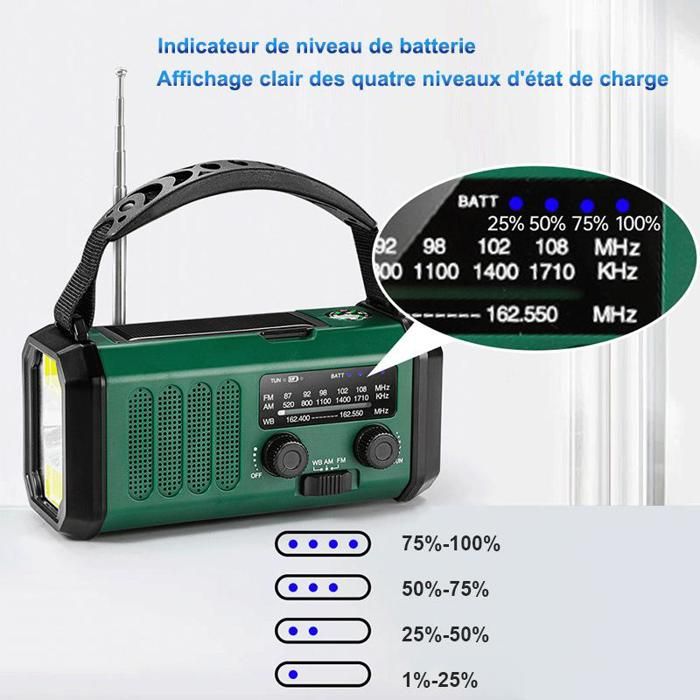 Radio à Manivelle Urgence Camping Radio Manivelle Urgence - Lampe Multifonction Voyage Radio Urgence Antenne Radio Portable AM/FM - Mini Radio Piles - Antenne Télescopique - Son HiFi - Pour Randonnée Et Camping Antenne Télescopique Réception Amazon Portable Fm Radio Format compact léger : Grâce à son facteur de forme petit et léger, cette radio portable s'intègre facilement à votre quotidien en déplacement, en camping ou pour une écoute détendue à la maison sans encombrement. Dotée d'une lampe de poche, elle convient parfaitement à une utilisation domestique, aux activités de plein air comme le camping et la randonnée, ainsi qu'aux besoins de voyage. En raison de différentes mesures manuelles, veuillez permettre une différence de taille de 1 à 2 cm. Radio solaire portable, radio AM/FM/NOAA auto-alimentée à manivelle, dispositif d'urgence météo avec lampe de poche 3 LED et chargeur de téléphone portable pour randonnée et camping (rouge Liberté audio personnelle : La prise casque permet une expérience immersive sans créer de nuisances sonores, idéale pour un usage privé dans les lieux publics ou à domicile. Radio Portable Haute Qualité AM/FM Équipé d'une puce DSP anti-interférences pour améliorer efficacement la sensibilité de réception. Prend en charge les signaux ultra-larges dans les bandes FM (87-108 MHz) et AM (520-1730 KHz). Son antenne télescopique ultra-longue à 6 sections assure une réception puissante, capturant parfaitement toutes les fréquences disponibles dans votre... Confort d'écoute : Mécanismes de contrôle précis et ergonomiques avec molette de tuning réactive et réglage sonore intuitif garantissant une expérience utilisateur optimale pour chaque auditeur Matériel: AbsTaille du produit: environ 11x6x2,7 cm / 4., 33x2., 36x1,06 poucesFréquence correspondante: FM 87-108 MHz, AM 520-1730KHzAlimentation de la batterie: batterie au lithium intégrée 3,7 V, capacité de batterie 800mAhBatteries externes 2 x 3a (non incluses)Liste des packs.