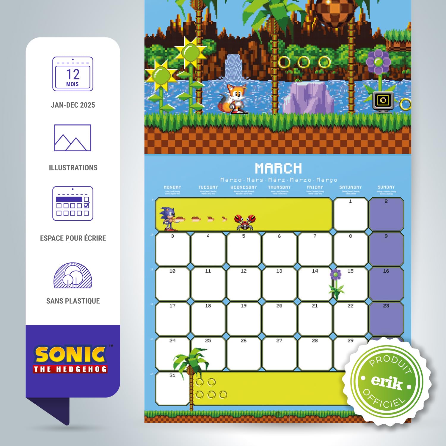 Les fans du plus célèbre des hérissons pourront retrouver les personnages emblématiques des jeux Sonic sur ce calendrier mensuel 2026 haut en couleur Ce calendrier mural est l'accessoire idéal pour ne jamais manquer un rendez-vous tout en apportant une touche stylée et fonctionnelle à votre intérieur. Grupo Erik Grupo Erik - Calendrier Mural 2026 Sonic | Calendrier Mensuel 2026-30x60cm - De Janvier à Décembre Livraison gratuite 99 Ce magnifique calendrier Sonic 2026 Grupo est fait de papier glacé et commence en janvier 2026 et a une grande belle image de Sonic jusqu'en décembre 2026 avec les dates disponibles du mois en dessous avec beaucoup d'espace pour les notes personnelles et les anniversaires JANVIER à DÉCEMBRE 2026 - Ce calendrier mensuel vous accompagne tout au long de l'année 2026, avec une page dédiée pour chaque mois, de janvier à décembre, pour une organisation optimale et sans faille Groupe Tonic | Créateur d'expériences mémorables | Montréal 2026 Il s'attache facilement au mur et s'intègre parfaitement dans n'importe quel espace en apportant une touche décorative à votre intérieur PAPIER ÉPAIS - Fabriqué avec un papier mat de haute qualité de 140g, ce calendrier offre un grand confort d'écriture et est donc parfait pour s'organiser efficacement tout au long de l'année, sans bavures ni traces Calendrier Sonic 30x60cm Grupo Erik - Calendrier Mural 2026 Sonic | Calendrier Mensuel 2026 Calendrier Fan Jeux Vidéo Parfait pour un usage personnel ou professionnel, il combine organisation pratique et décoration moderne. Organisez votre année avec originalité grâce à notre calendrier mural 2025/2026 ! CALENDRIER MURAL - Une fois déplié, le calendrier mesure 30x60 cm, offrant une vue claire et détaillée de chaque mois.