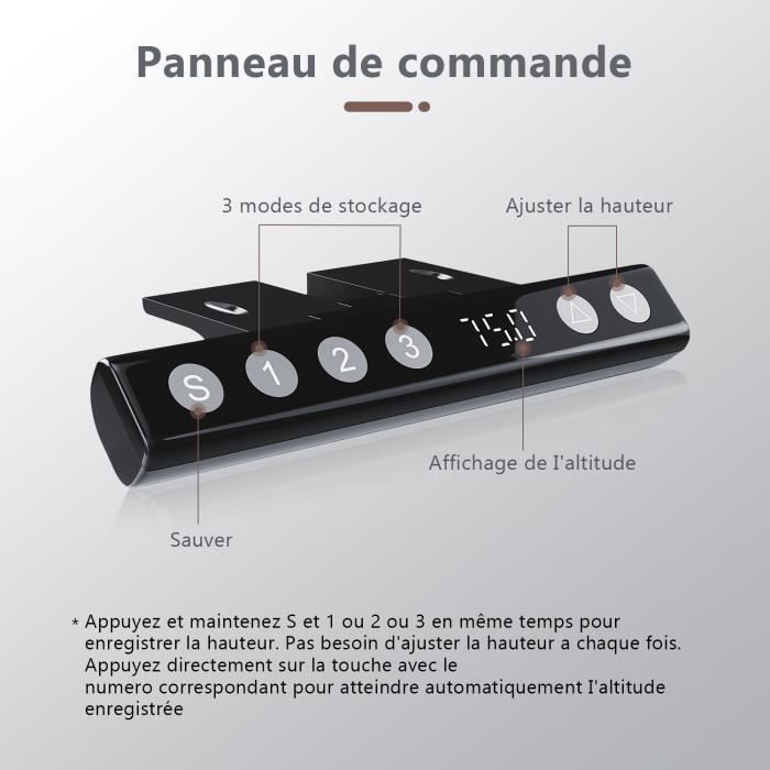 Test du bureau réglable IvyIvy : assis/debout électrique, 4 mémoires (76x160 cm Rangement Bureau Bureau Homavo électrique Réglable 140x60 Cm – Fonction Mémoire & Anti Bureau Réglable Hauteur Moteur En cas de résistance lors du levage, le bureau se déplace automatiquement de 2 cm dans la direction opposée. 3 réglages de hauteur avec mémoire : la hauteur du bureau est réglable entre 70 et 115 cm, et sa longueur entre 105 et 130 cm. Vous pouvez définir et conserver trois hauteurs différentes selon vos besoins. Bureau assis-débout Echo 160 - franco de port Structure de haute qualité : Le bureau est fabriqué en acier, stable et fiable, résistant à la déformation et capable de supporter une charge maximale de 60 kg. Bureau assis debout incurvé - DYNAMIC CIRCLE SMOOTH 160x80 cm Moteur sans balais longue durée : Équipé d’un moteur sans balais sûr et fiable, il assure vitesse et silence pendant le levage (vitesse de 18 mm/s, bruit inférieur à 45 décibels), garantissant un environnement de travail silencieux. L'écran affiche clairement la hauteur actuelle.