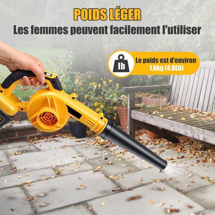 Performance efficace : équipé d'un moteur entièrement renforcé en cuivre et d'une technologie turbocompresseur à six roues motrices qui offre une forte puissance de vent et d'aspiration pour garantir des résultats de nettoyage efficaces. La vitesse maximale est jusqu'à 50 000 tr/min et garantit une puissance de vent élevée. Batteries 21 V, double autonomie]: Le souffleur électrique est alimenté par deux batteries rechargeables de 21 V, garantissant une alimentation continue sans fil.C'est un outil parfait Ce souffleur à feuilles à batterie est doté d'un variateur de vitesse à 5 vitesses et d'un débit d'air de 240 à 600 pieds cubes par minute (PCM). Son design ergonomique minimise l'inconfort au poignet Le moteur en cuivre pur et le design turbocompressé ultra puissant garantissent la stabilité et la durabilité de l'équipement. Souffleur de Feuilles 21 V - Souffleur de Feuilles électrique portatif 【Forte portabilité】Alimenté par des batteries au lithium, équipé d'une batterie et d'un chargeur, pratique pour les utilisateurs à tout moment. Et offrent des services de garantie à vie, de sorte que les utilisateurs ne s'inquiètent pas après l'achat. Outil Jardin Sans Fil Multifonction Souffleur à Feuilles électrique Sans Fil 21 V, Batteries Et Chargeur Inclus Sac Collecteur 2 Buses Large Etroite Pour Jardin 97522899 Outil Jardinage Léger Et Puissant Design amovible qui se démonte et se transporte facilement. Souffleur à feuilles électrique sans fil avec batterie et chargeur, mini souffleur à feuilles portable 2 en 1 pour l'entretien de la pelouse, la poussière et le déneigement 【Design multifonctionnel】Ce souffleur à feuilles a trois fonctions : soufflage, aspiration et pulvérisation, adapté à différents besoins de nettoyage.