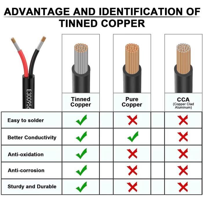 Câble électrique 5 mètres 16 AWG 2x1,5mm² à 2 conducteurs, fil de cuivre étamé flexible, impédance faible, compatible alimentation LED 5V / 12V / 24V, résistance aux hautes températures en destockage et reconditionné chez Idéal pour les rallonges, les bandes lumineuses LED, l’éclairage basse tension, les appareils électroniques et les produits 5 V / 12 V / 24 V / 230 V basse tension Du câble téléphonique au cordon d'alimentation de la télévision, en passant par la boite de dérivation et les connectiques informatiques pour tous vos appareils, sans oublier les moulures et plinthes, pour finaliser votre installation, tout est à portée de clic Description Rallonge Prolongateur Jardin o mètres avec clapet - section 2x1,5 mm² orange. Câble HO5 VV-F - Section 2x1,5 mm². Toutes les fiches sont équipées de protection enfant. Empêche l'introduction de corps étranger dans la prise. Puissance enroulée 1100W, puissance déroulée : 3200W Haute conductivité : Câble de terre 16 AWG 1,5 mm² avec 2 fils, chacun composé de 26 brins de fil de cuivre étamé de 0,25 mm d’épaisseur. En cas de problème dans l’année, contactez-nous — nous résoudrons toute difficulté sous 24 heures Câble anti-feu CR1 pour sécurité incendie C1 2x1,5mm Couronne de 50m Facile à utiliser : Câble flexible, facile à dénuder, à souder et à couper. Haute conductivité : Le matériau conducteur est le cuivre étamé. Température de fonctionnement nominale jusqu’à 80℃. Température de fonctionnement nominale jusqu’à 80 ℃. Spécification : Câble 16 AWG à 2 conducteurs (rouge, noir, jaune, blanc, vert et orange)., Tension maximale : 300 V., Courant maximal : 11 A. Matériau durable : Câbles en cuivre étamé avec gaine en PVC, protégeant contre l’effilochage. Haute conductivité et faible résistance, facile à souder, à connecter et à couper Robuste : Le matériau de gaine/isolation est en PVC (RoHS), protégeant les fils contre l’usure, le soleil et la corrosion chimique.