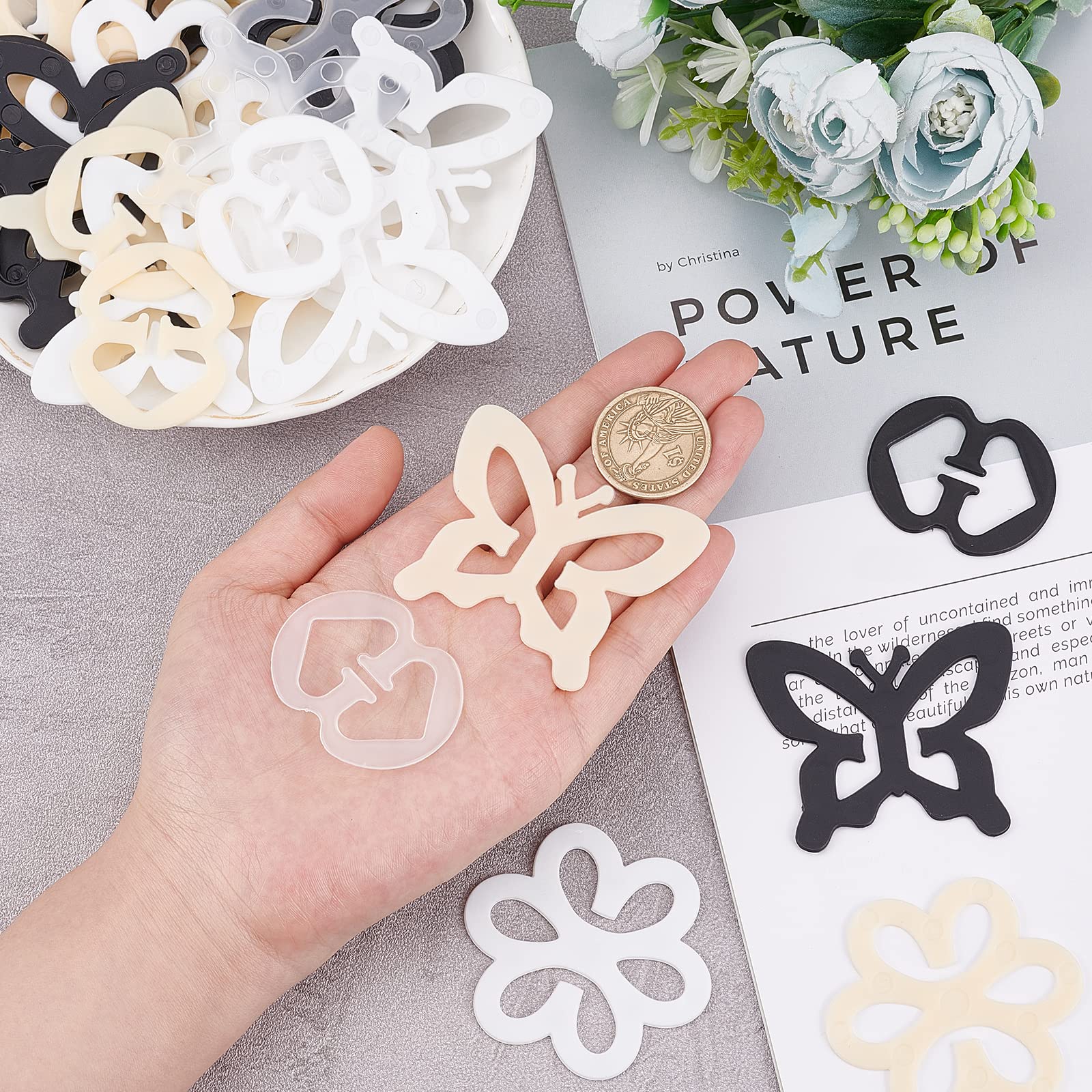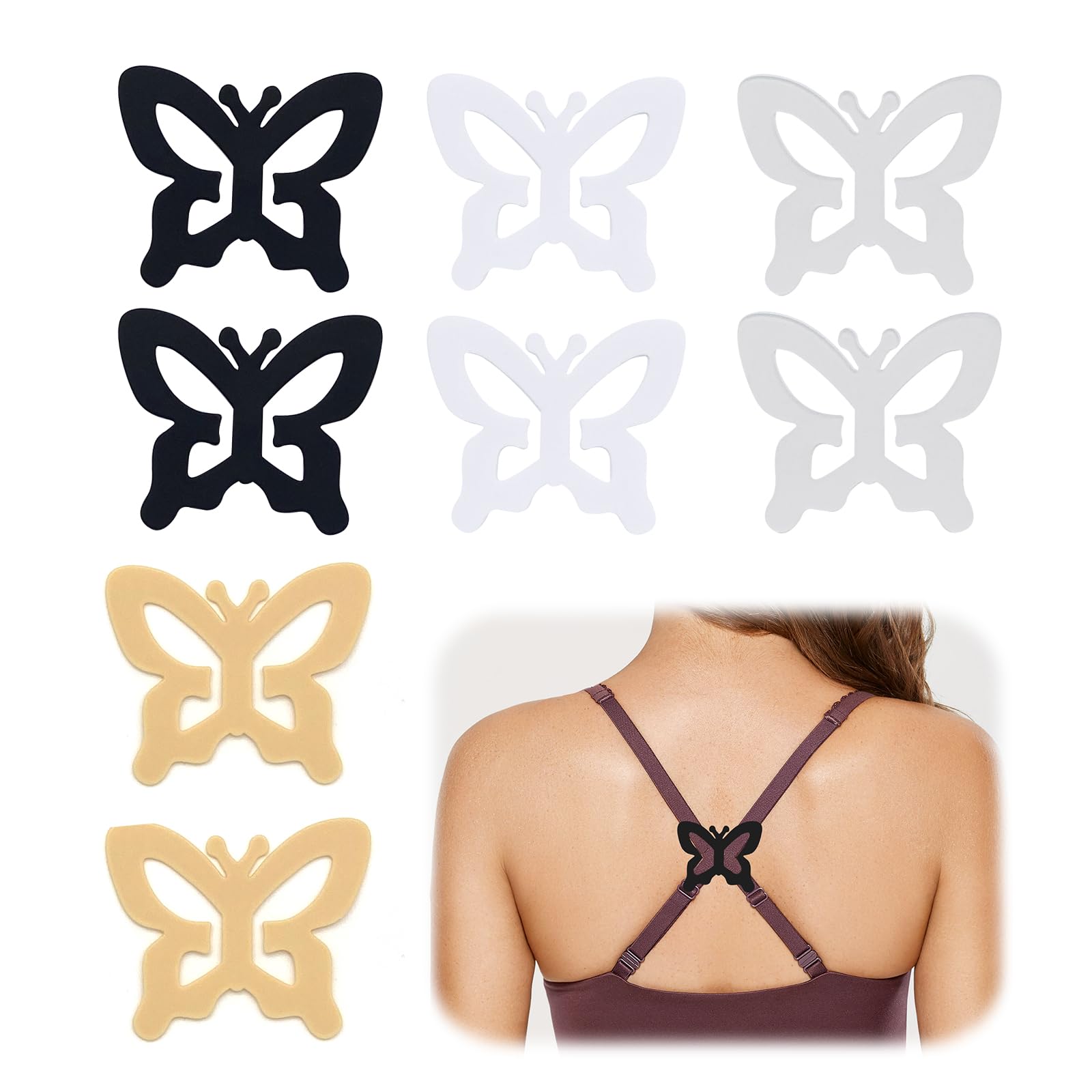 Parfait pour changer les besoins et facile à emballer pour les voyages., 2., Clip à sangle invisible : les clips de soutien-gorge sont conçus pour cacher les bretelles de soutien-gorge lorsque vous portez des débardeurs dos nageur et des vêtements sans manches. Principaux points forts · Clips invisibles pour bretelles de soutien-gorge : gardez vos bretelles de soutien-gorge en place sans qu'elles ne soient visibles Ils convertissent facilement vos bras en bras croisés et cachent les sangles sous les vêtements, résolvant le problème des sangles de glissement et accentuant votre silhouette., 3., Matériau de haute qualité : fabriqué en plastique durable avec des bords lisses, les clips de sangle de soutien-gorge ne causent pas de confort ou d'irritation de la peau pendant le port et ils peuvent être facilement ajustés pour un ajustement confortable., 4., Facile à utiliser : il suffit d'attacher le clip antidérapant à une position de la sangle d'épaule, puis de connecter les deux sangles d'épaule à la boucle. Clip à sangle invisible : les clips de soutien-gorge sont conçus pour cacher les bretelles de soutien-gorge lorsque vous portez des débardeurs dos nageur et des vêtements sans manches. Large application : convient aux robes, aux robes du soir, aux hauts dos nageur, aux t-shirts, aux débardeurs, aux hauts de bikini, aux vêtements de fitness et d'activité. Papillon Pour Soutien Gorge Clips Dos Nageur Robes Clips Bretelles Soutien-gorge HUTRADE - Lot De 8 Couleurs - Anti-glissement Clip Papillon Bretelles Attache Bretelles Dos Nu Libérez vous-même des sangles et trouvez une position qui vous convient le mieux., 5., Large application : convient aux robes, aux robes du soir, aux hauts dos nageur, aux t-shirts, aux débardeurs, aux hauts de bikini, aux vêtements de fitness et d'activité. Ils convertissent facilement vos bras en bras croisés et cachent les sangles sous les vêtements, résolvant le problème des sangles de glissement et accentuant votre silhouette. Facile à utiliser : il suffit d'attacher le clip antidérapant à une position de la sangle d'épaule, puis de connecter les deux sangles d'épaule à la boucle. Idéal pour la course, l'escalade, le yoga et l'entraînement. 1, 2, 4 ou 8 pièces Clips de bretelles de soutien-gorge Accessoires de soutien-gorge polyvalents : l'ensemble comprend un total de 8 clips de soutien-gorge antidérapants en forme de papillon en noir, blanc, beige et transparent (2 pièces de chaque couleur). Soutien-Gorge pour Femme Adhésif