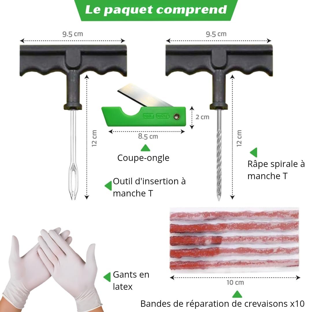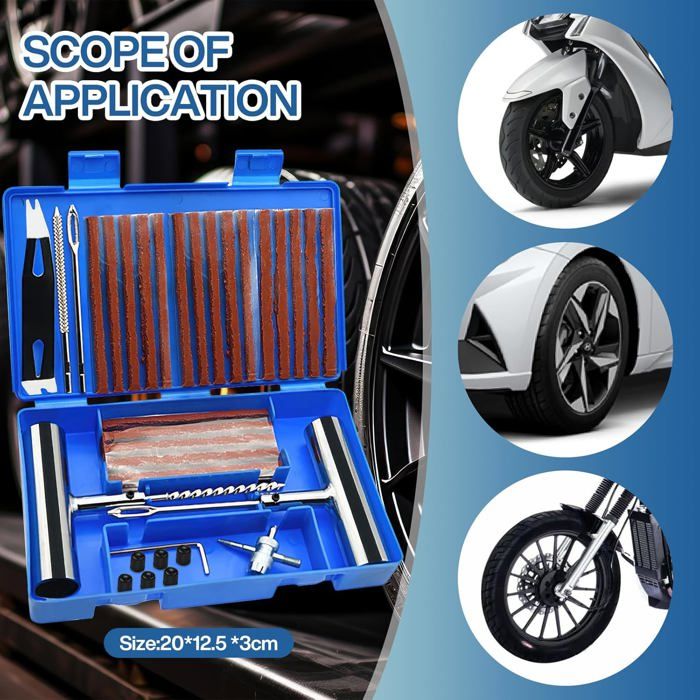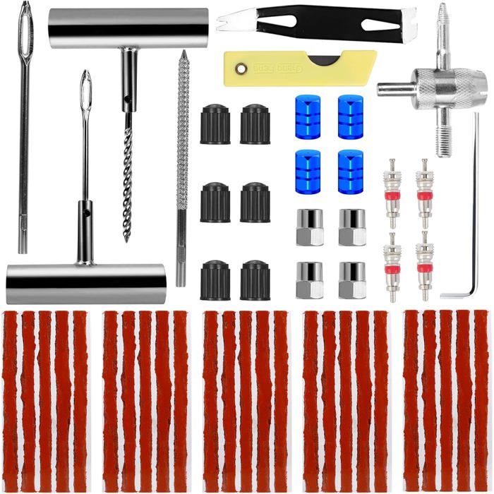 Kit de réparation crevaison pneu 5 mèche tubeless RÉPARATION EN 15 MINUTES - Ce kit de réparation pneu voiture et moto permet de réparer une crevaison en un rien de temps, sans avoir à emmener la roue dans un atelier. Reparation Pneu Voiture JOIYHY Kit De Réparation Crevaison Voiture, Kit Meche Pneu Réparation Pneus Sans Chambre Conseils chaleureux: Ce kit de réparation de pneus de voiture recharge pneu est pratique et rapide, il est un accessoire de recharge de pneu portable pour les propriétaires de voitures. FACILE À UTILISER - Leurs deux outils métalliques sont conçus de manière ergonomique pour être faciles à tenir et à utiliser, ce qui vous permet de percer la surface du pneu sans vous abîmer les mains Vous pouvez donc l'emporter avec vous à tout moment pour effectuer des réparations d'urgence et rapides sur les pneus dans des conditions difficiles. 9pcs Kit de Réparation Pneu Tubeless Voiture Moto Auto Crevaison 5X... Kit réparation pneumatique, mèche pneu, avec outils - Quick and Safe Réparez facilement tous les types de pneus sans chambre à air sur les voitures, motos, fourgonnettes, VTT et plus encore. HAUTE QUALITÉ - La réparation de crevaison de pneus se compose de pièces fabriquées de haute qualité, pour vous assurer que ces outils vous dureront pendant de nombreuses réparations de pneus et vous feront traverser des situations collantes. KIT DE RÉPARATION DE PNEUS TUBELESS - Notre kit de réparation de crevaison Comprend 25 mèches, 1 outil en T en spirale, 1 outil en T d'insertion.