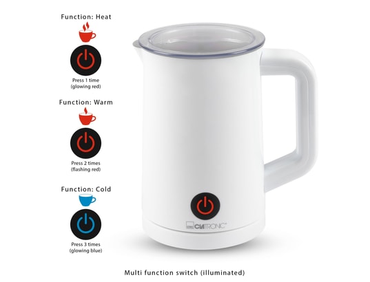 Avec le mousseur à lait Clatronic MS 3693, vous embellissez chaque création de café avec une mousse de lait parfaite. Vous pouvez également faire du chocolat délicieux et chaud en appuyant simplement sur un bouton Facile à Nettoyer : Son Revêtement antiadhésif lisse le rend très facile à nettoyer; la coque résise à la chaleur et empêche les brûlures; le mousseur à lait se fermera automatiquement lorsque du lait chaud ou de la mousse est prêt : fonction d'arrêt automatique Mousseur Lait Mousseur à Lait Électronique Clatronic MS 3693 / Blanc Arrêt Automatique Nettoyage Facile Description du produit Fonction chauffante intégrée - Mousse de lait en quelques secondes - Convient également pour les chocolats chauds et froids - Récipient antiadhésif (environ 550 ml - Quantité de mousse de lait : environ 300 ml ■ Interrupteur multifonction (éclairé) Faire mousser le lait chaud Faire mousser le lait froid (idéal pour le café glacé) Réchauffer le lait ■ Élément chauffant caché ■ Arrêt automatique ■ Couvercle inclus ■ Avec fonction anti-éclaboussures ■ Marmite supplémentaire pour boissons chaudes sans mousse (par exemple cacao) ■ Couvercle ■ Couvercle ■ Couvercle Amovible pour un nettoyage facile. Vous pouvez donc acheter ce produit en toute sécurité. Si toutefois, vous n'êtes pas satisfait du produit, contactez notre SAV. Spécifications techniques · Capacité du récipient : 550 ml · Capacité de mousse : 300 ml · Puissance : 500 W · Tension d'entrée : 220-240 V · Fréquence d'entrée : 50... Émulsionneur et mousseur à lait - Boutique de la Cuisine Simple à Utiliser : Le mousseur à lait peut chauffer le lait, la mousse chaude, la mousse froide, avec un seul bouton, vous pouvez profiter de boissons de qualité café telles que le café, le cappuccino, le latte, le lait chaud, le chocolat chaud, etc. Garantie : Clatronic vous offre une garantie de 1 an. Mousseur de Lait rapide : Le mousseur à lait Clatronic peut chauffer le lait à votre température préférée et faire mousser le lait en 1 à 2 minutes, et donner au lait une texture lisse, vous permettant de faire de délicieuses boissons au café comme cappucino, macchiato