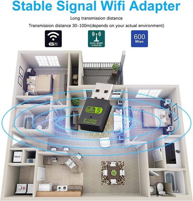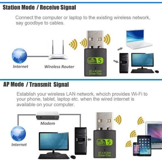 Taux de transmission : 600 Mbit/s (11N : 150 Mbit/s, 11AC : 433 Mbit/s)., Normes : IEEE 802., 11AC, 802., 11b, 802., 11g, 802., 11n. Toutefois, afin d'éviter tout malentendu inutile, il y a encore quelque chose que je devrais vous dire avant d'essayer de laisser une plainte de vitesse., 1., Vous devez avoir un routeur WiFi double bande avec bande 5G si vous voulez obtenir un signal 5G., 2., La vitesse maximale jusqu'à 433 Mbit/s fonctionne uniquement lorsque vous vous connectez à la bande 5G, sinon il fonctionnera à 2,4 G avec la vitesse maximale de 150 Mbit/s., 3., Si votre ordinateur est un ordinateur de bureau et que la vitesse n'est pas idéale, vous pouvez essayer de brancher votre adaptateur WiFi dans le port USB arrière de votre PC, car ce port peut garantir l'alimentation., 4., Cet adaptateur WiFi USB sans fil ne peut pas augmenter la vitesse du routeur d'origine, il transmet juste le signal Wi-Fi., 5., Si vous voulez obtenir une vitesse incroyable en regardant des vidéos ou en jouant à des jeux en ligne, nous vous suggérons de vous connecter au signal WiFi 5G et de laisser votre adaptateur WiFi se rapprocher de votre routeur WiFi. Mais si l'adaptateur WiFi est loin de votre routeur, et que vous voulez simplement surfer sur le site Web, la bande 2,4 G est un meilleur choix pour obtenir un signal stable. Pour le transfert de données, l'édition ou l'impression, la distance de connexion la plus longue est de 10 m (uniquement compatible avec Windows 7/8/8., 1/10) WiFi et Bluetooth 2 en 1 : les deux antennes peuvent recevoir des signaux forts. Adaptateur Bluetooth 4.0 Usb 600 Mbps BT Modèle A - Adaptateur USB WIFI Bluetooth, Antenne Sans Fil WiFi 5 GHz Contenu : 1 adaptateur USB WiFi Bluetooth 600 Mbit/s 1 lecteur CD. Le WiFi est adapté pour Windows 7/8/8., 1/10/XP, il suffit de le brancher et de l'utiliser. Type d'interface : USB 2., 0., Gamme de fréquences : 2,4 GHz + 5,8 GHz. Si votre ordinateur ne peut pas accéder à Internet ou ne peut pas lire le pilote CD, c'est le choix parfait. Klanata Adaptateur et Android Auto sans Fil 2 en 1, dongle USB Filaire vers sans Fil avec Bluetooth 5,2 et WiFi 5,8 GHz, boîtier de Voiture Plug and Play pour iOS 10 ou Version Facile à utiliser, seulement 3 étapes : 1., Branchez votre adaptateur WiFi dans le port USB de votre ordinateur (prise en charge USB 2., 0/3., 0)., 2., Le panneau de commande de l'ordinateur ouvrira la fonction AutoPlay ou vérifiez « Driver_Di-Sk » pour installer le logiciel pilote., 3., Sélectionnez le fichier approprié pour votre système « Windows/Mac », puis choisissez votre réseau et entrez le mot de passe. Gain d'antenne : 2 dBi. Pilote gratuit : l'adaptateur est un logiciel pilote intégré. Caractéristiques : Version Bluetooth : 4., 0., Chipset : RTL8821CU. Adaptateur USB WiFi Bluetooth Récepteur réseau sans fil double bande 600Mbps 2.4 / 5Ghz Descriptifs : L'adaptateur est un logiciel de pilote intégré, insérez la carte réseau sans fil, le pilote s'installera automatiquement et permettra à votre ordinateur de se connecter au WiFi USB WiFi 600 Mbps Adaptateur sans Fil Carte Ethernet Double Bande Carte Dimensions : 3,1 x 1,5 x 0,8 cm., Couleur : noir.