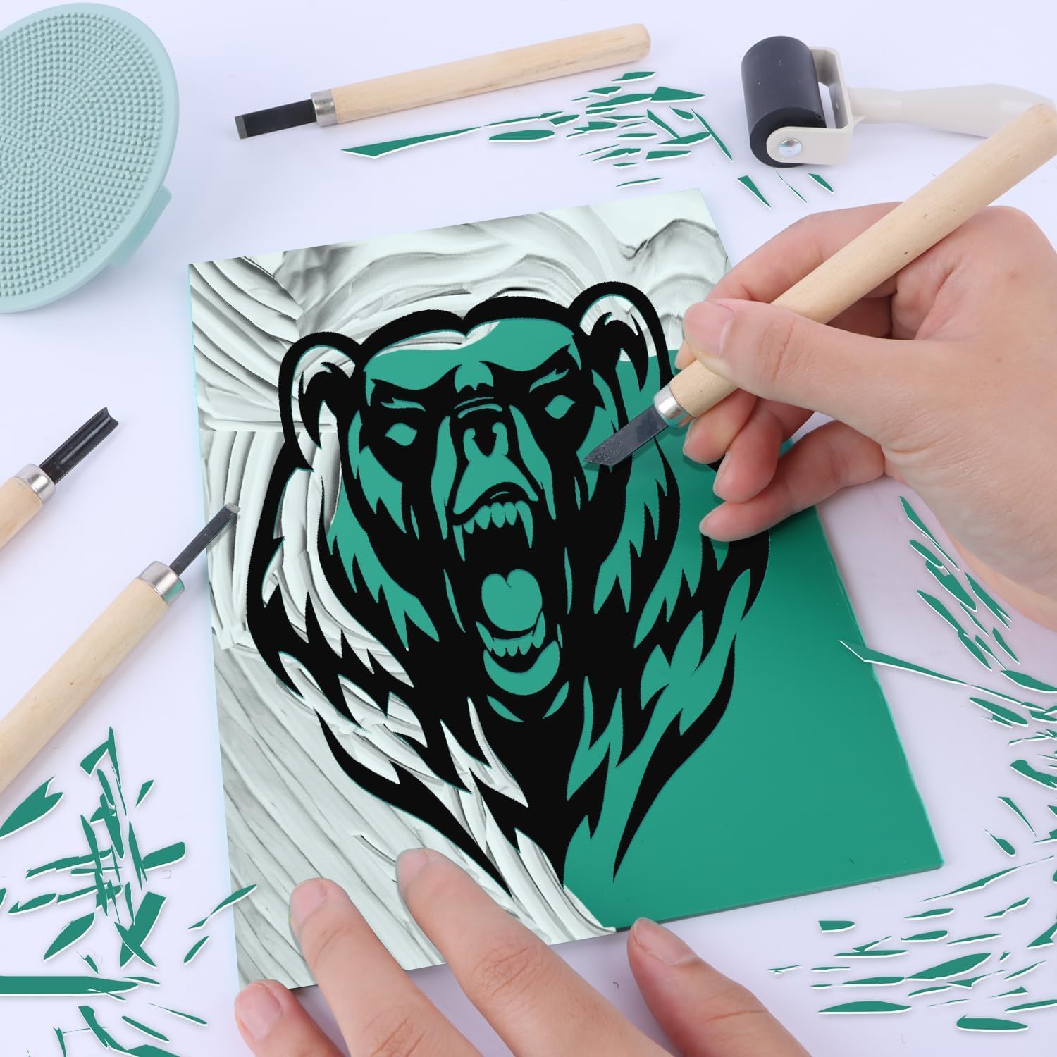 Lot de 9 tampons en caoutchouc linoléum Contenu : lot de 9 plaques de lino au total, 1 plaque de lino A4, 1 plaque de lino A5, 1 plaque de lino A6, 1 rouleau, 1 Ma Lian, 4 outils de sculpture. Les plaques de lino peuvent être coupées en petites pièces, et vous pouvez facilement créer vos propres tampons ou blocs d'impression Contenu : le kit de plaques de lino comprend un total de 9 pièces : 1 plaque de lino A4, 1 plaque de lino A5, 1 plaque de lino A6, 1 rouleau, 1 Ma Lian et 4 outils de sculpture. La sculpture est plus facile et plus sûre que les panneaux en bois, de sorte que vous pouvez être créatif sans être dérangé. Elle se déplace en douceur et ne nécessite pas beaucoup d'efforts, ce qui vous permet d'économiser du temps et des efforts. Tampons Personnalisés Impression Artisanal EXCEART Lot De 10 Tampons En Caoutchouc, Blocs De Sculpture En Kit Démarrage Gravure Les plaques de lino peuvent être coupées en petits morceaux pour créer vos propres tampons ou blocs d'impression. Il reste suffisamment de matériau pour vos projets pour obtenir des contours et des détails clairs. Outils merveilleux : le kit de plaques de lino comprend 4 outils de sculpture avec différents bords de coupe qui facilitent la sculpture de n'importe quelle forme souhaitée. Matériaux de qualité : les plaques de lino sont en caoutchouc souple PVC de qualité supérieure, ce qui permet une gravure sans effort. Matériel Sculpture Tampon Kit Linogravure 9 Pièces - Blocs Le rouleau en caoutchouc est fabriqué en caoutchouc élastique, tandis que le Ma Lian est fabriqué en plastique ABS robuste, stable et ne se casse pas facilement ou ne se déforme pas. Les produits les plus populaires dans la catégorie Impression Lino Impression Lino Offre Lot de 4 crochets d'établi et plaque d'encrage pour gravure sur bois, bloc de gravure en métal (23 x 18 cm) 43,94 € Livraison GRATUITE 2.5% 1,10 € de Cashback Offre Coupe-blocs d'art - Outils de sculpture sur linoléum artisanal 22,05 € Livraison...