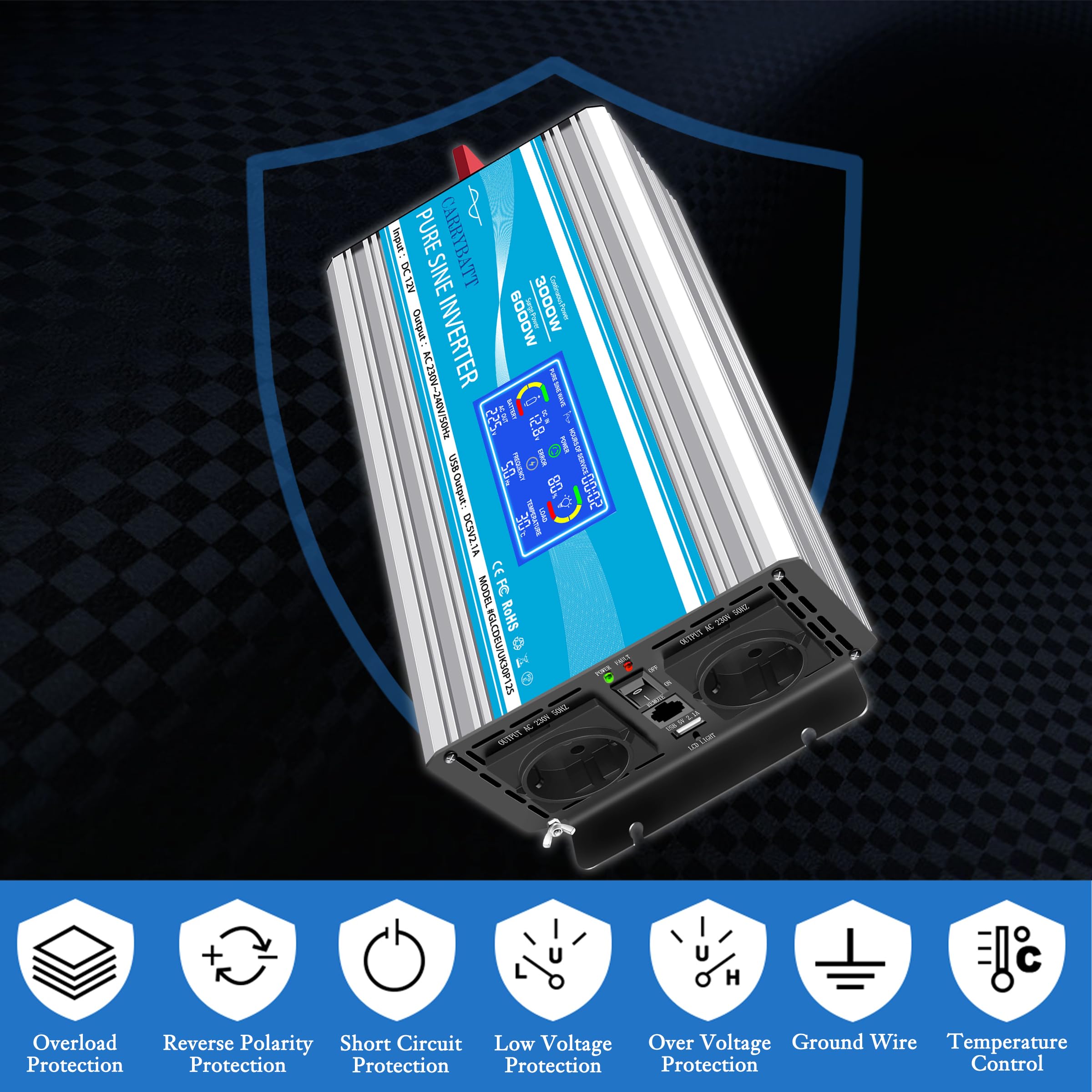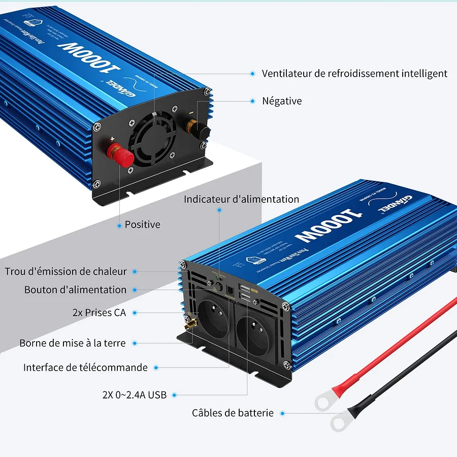 【MUTI-APPLICATION】Lorsque vous caravane,camion,que vous camping. Deux prises françaises Il fonctionne sans problème et offre une puissance continue. Fournit une puissance continue de 1000 watt,et obtient une puissance de pointe de 2000 watt. Convertisseur Chargeur Pur Sinus 12V/230V 1000W Nous espérons fabriquer plus de produits qui satisfont nos clients. 【CARRYBATT DE TENSION PUR SINUS】CARRYBATT Convertisseur Pur Sinus onduleur à onde sinusoïdale pure a deux prises de sortie 220v à 240v AC et un chargeur usb 2., 1A, qui peut être connecté à tout appareil ménager 220v 230v 240v, ordinateur portable ou téléphone mobile. Ils fournissent des services de qualité pour nos produits et fabriquent de meilleurs produits. Vous pouvez installer les commandes à un endroit plus pratique et conserver la fonctionnalité de l'onduleur. Le voyant LED ne s'allume pas: pas d'alimentation, ou le fusible est grillé. CARRYBATT 1000W Convertisseur Pur Sinus 12V 220V 230V Onduleur à Onde Sinusoïdale Pure Transformateur Inverter avec télécommande & 2 Prises EU et 1 Port USB pour Voiture,Camion,RV Voyant rouge allumé: l'appareil démarre la fonction de protection. Alarme sonore de sous-tension. Quel est le eilleur Convertisseur 12v 220v Pur Sinus pour les Caping... En tant que marque mature, nous accordons toujours la priorité aux sentiments du client et gardons toujours la qualité et le service. Indicateur d'alimentation: l'état électrique peut être vu. Laissez l'onduleur être silencieux et silencieux à des heures ordinaires, et réduisez le bruit pendant que le vent fort dissipe la chaleur. Onduleur peut être connecté à tous vos appareils de cuisine et n'a besoin que d'une batterie d'alimentation de 12 V DC pour fournir de l'électricité, comme les machines à café, le réfrigérateur, le micro-ondes, la bouilloire, le grille-pain et l'aspirateur, etc. Convertisseur 12v/220v Pur Sinus CARRYBATT 2500W Convertisseur Pur Sinus 12V 220V 230V Onduleur Onde Sinusoïdale Pure Transformateur De Tension Avec Télécommande & 2 Prises EU Et 1 Port USB Pour Voiture,RV, Voyage Transformateur 220v 12v Nous offrons toujours un service de 12 mois et une réponse de 24 heures. Le boîtier en aluminium durable peut protéger l'onduleur des chutes et des chocs. Nous avons des usines spécialisées et des talents de haute technologie. 【PACKAGE】CARRYBATT 1000W camping car Convertisseur DC 12v AC 220v,1x télécommande,1X manuel d'utilisation, 1X jeu de câbles pour la batterie de l'onduleur,Fusibles de rechange,une garantie de 12 mois, une réponse à toute question co.