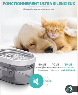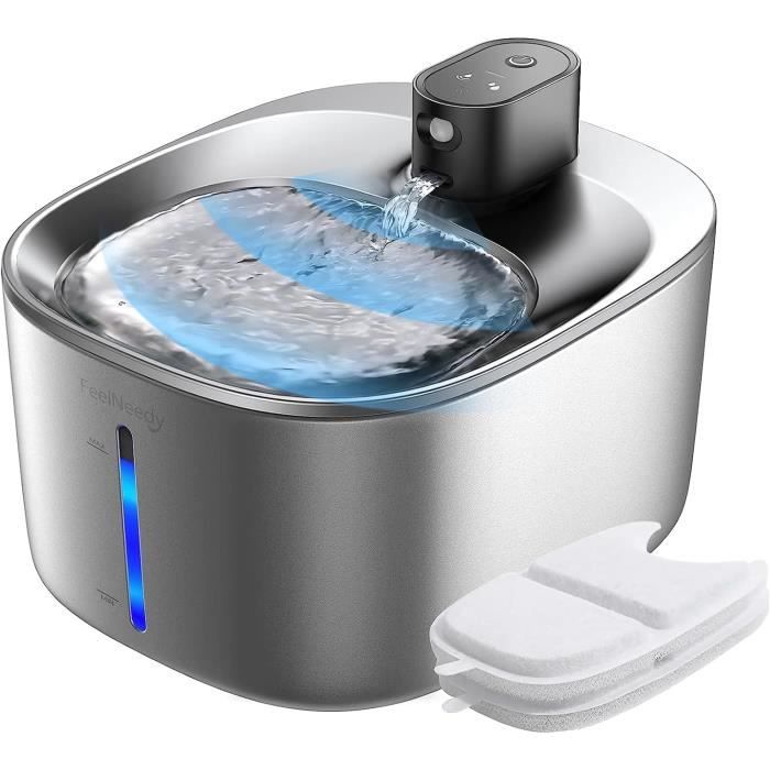 Inclus : un adaptateur de charge et un câble anti-mâchouillage — finis les câbles endommagés Cette fontaine à eau est idéale pour les chats et les petits chiens. L'écoulement en continu empêche l'eau de stagner et encourager votre animal de compagnie à s'hydrater tout au long de la journée Détection automatique : quand votre chat s'approche à 1,5-2,5 mètres, un flux d'eau fraîche se déclenche pendant 12 secondes — encourageant votre animal à boire davantage. Son design sans recoins permet un nettoyage rapide et sans résidus Le filtre combine : KDF, charbon actif, résine ionique, pierre de Maifan, tourmaline, charbon de noix de coco et coton Fontaine Chat Détecteur Mouvement DownyPaws Fontaine A Eau Chat Sans Fil, 2,5L Fontaine à Eau Pour Chat Fontaine à Eau Chat Sans Fil La fontaine eau chat et fontaine chat détecteur mouvement vous permettent de changer facilement entre les modes d'un simple bouton :① Détection intelligente (fontaine à eau chat détecteur de mouvement)② Flux programmé③ Flux continu (branché) Idéale pour les foyers multi-animaux. Grâce à sa filtration 6 étapes, cette fontaine à eau pour chat sans fil offre une eau oxygénée, sans poils, sédiments ni impuretés. Sécurité et Nettoyage Facile. Test de la fontaine à eau sans fil pour chat Inox : détecteur de Conçue en acier inoxydable 304 de qualité alimentaire, cette fontaine à eau pour chat à pile est lavable au lave-vaisselle et durable. Fontain à au chat achat n lign au millur prix sur . Rtrait gratuit dans d 700 magasins