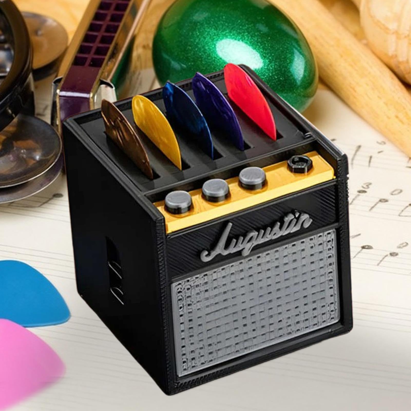 Excellente idée cadeau : un cadeau idéal pour les guitaristes, les membres du groupe ou les amateurs de musique. Boîte de support pour médiators de guitare, pour ampli de Mini support de médiator pour ampli guitare - Une organisation élégante pour les médiators ! Gardez vos médiators bien organisés et ajoutez une touche de personnalité à votre espace de pratique avec nos mini supports pour médiators Peut contenir jusqu'à cinq médiators : garde vos médiators les plus utilisés organisés et facilement accessibles pendant l'entraînement ou la performance. De taille compacte, il s'adapte bien sur les bureaux, les étagères ou les configurations de studio, et sert également de pièce d'affichage attrayante pour les guitaristes et les amateurs de musique. Chaque lot comprend une élégante boîte de rangement et cinq médiators en celluloïd de haute qualité pour vous aider à démarrer immédiatement. Conçu pour durer, c'est un accessoire essentiel pour tout musicien qui aime le son et le look distinctifs de l'orange Compact et élégant : son faible encombrement s'adapte aux bureaux, étagères ou tables de studio sans prendre beaucoup de place. Il peut contenir jusqu'à cinq médiators de guitare, les gardant organisés et à portée de main pendant la pratique, l'enregistrement ou les spectacles en direct. Rangement Mediator Support De Médiator Pour Ampli Guitare Organiseur De Médiator Rangement Médiators Bureau